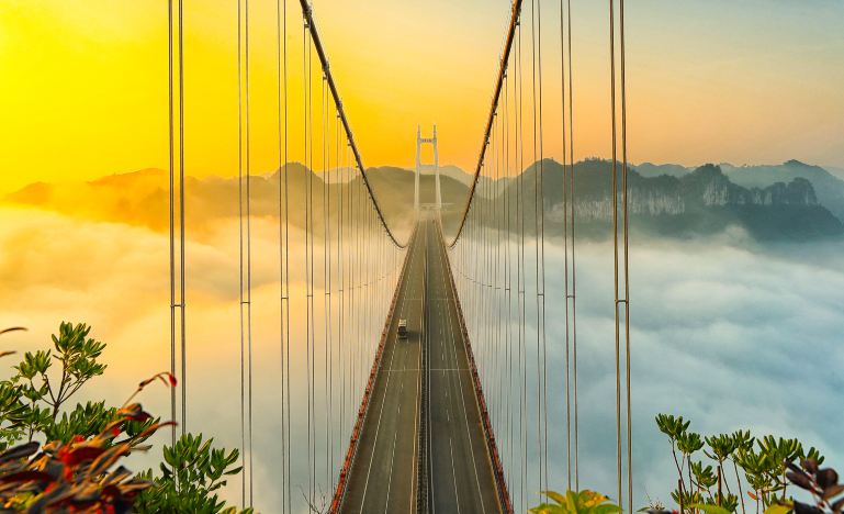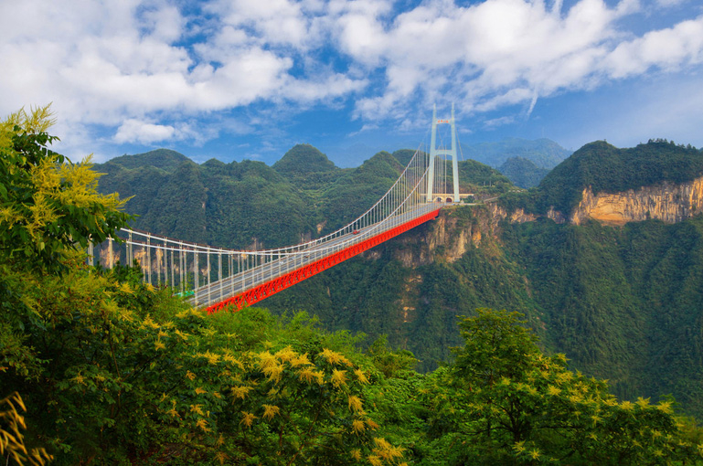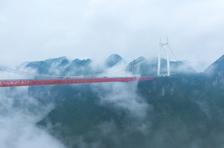 后至【矮寨大桥】(门票已含),乘观光电梯至大桥观光通道,近距离观亚洲第一的斜拉式铁索桥矮寨大桥。