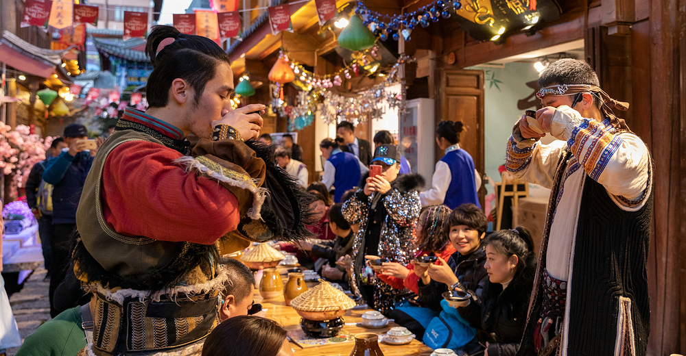 晚餐特色安排:“马帮菜荣归长街宴”(18:00-19:00),还原当年丽江马帮的就餐氛围,大口吃肉、大口喝酒,原生态的云南食材与特色的就餐演出,[遇见马帮菜]带你重走茶马古道,品尝正宗地道的马帮江湖味。晚餐结束后,观看表演《遇见·丽江》之永远的马帮(19:30-20:30),是由雪松文旅斥资打造的大型空间境遇剧,演出以马帮文化为主线,首创古镇实景沉浸式观演模式,打破传统镜框式观演,让观众全程参与剧情,身临其境地感受茶马古道的超凡魅力。