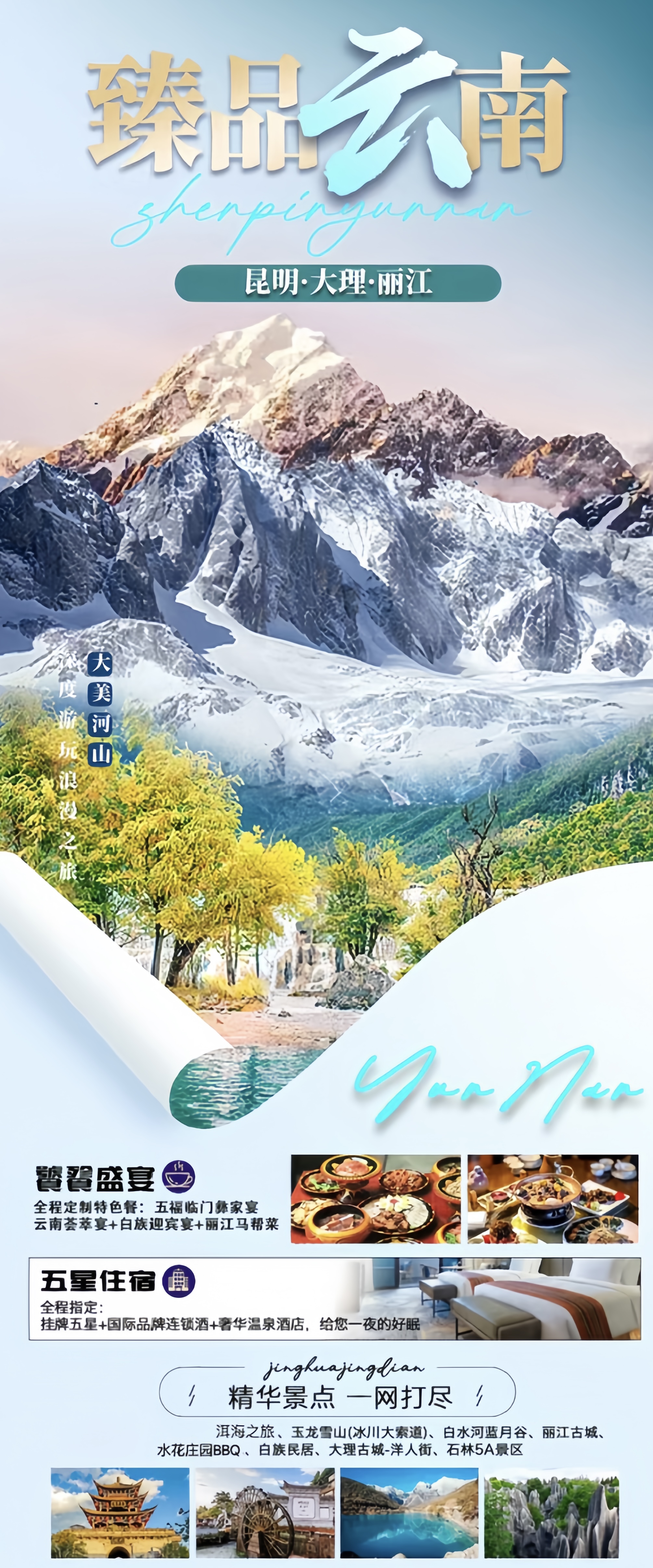 早餐后,乘车前往【翡翠博物馆综合店】俗话说“不赏翡翠枉来云南”,云南宝玉石资源储量大、品种丰富,是业内人士公认的“翡翠之乡”。之后前往玉龙雪山景区,抵达景区游览具有“东方瑞士“之称的【玉龙雪山风景区】,乘海拔4506米的【冰川大索道】游玉龙雪山,从海拔3000米的草甸出发,穿越高大的松杉树林,远眺纳西圣山,欣赏雄奇壮丽的玉龙雪山。游“小九寨”【蓝月谷】(温馨提示:游览约1小时,含电瓶),蓝月谷是条幽深的河谷。 冰雪从峰巅融化流淌而下,一落千丈,遇陡崖成瀑,过浅滩成溪,穿林过岩,清清澈澈地欢跳在人们面前)。回到玉龙雪山海拔3100米处,国际大导张艺谋导力作即将启幕,以雪山主峰为幕景的实景大型民族歌舞《印象丽江》雪山篇将在天地之间体验纯原生态演出(观赏时间60分钟)。