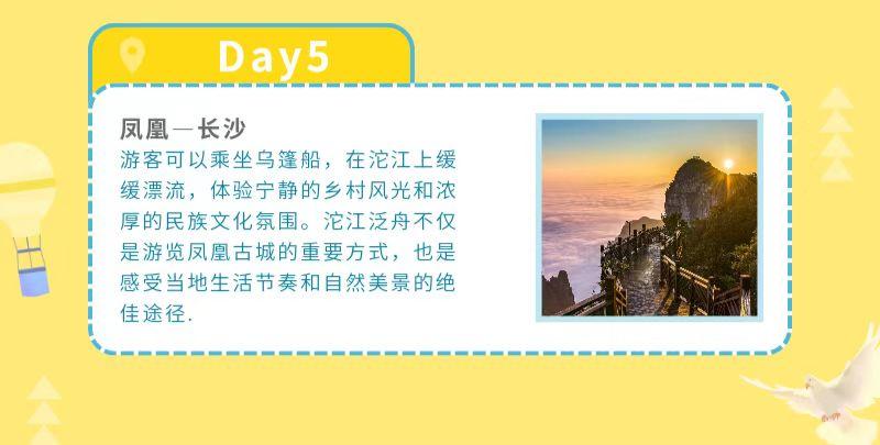 早餐后游览沈从文笔下如诗如画般缠绵的凤凰古城 :【沱江泛舟】、【陈斗南故居】;耐人寻味的古桥石栏,街边小店里西兰卡普,竹器等工艺品琳琅满目,尝尝当地的特色小吃,会令你食欲顿生,一尝难忘,让您感受真正悠闲的凤凰古城之行,中餐后返长沙(正常行车时间5.5小时,全程高速),结束行程。