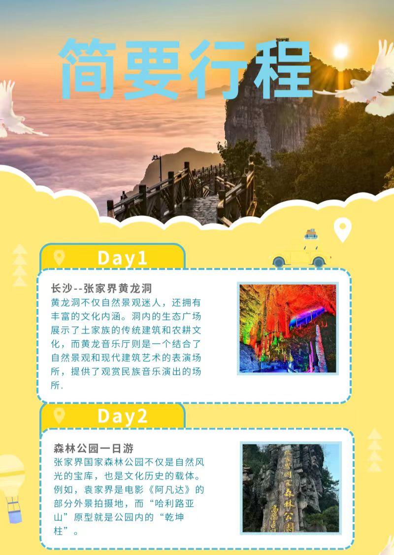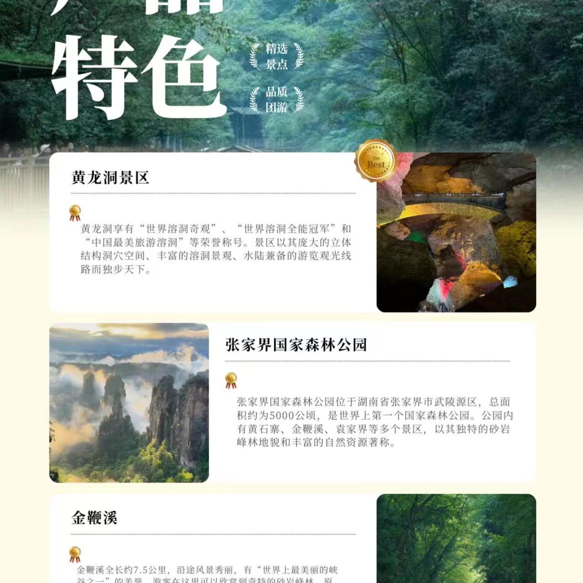 早7:00于长沙火车站阿波罗商业广场肯德基前坪集合,乘车赴张家界(约320公里,正常行车时间4小时30分钟,全程高速),中餐后游览【黄龙洞景区】,洞中有洞,洞中有河,无奇不有,名副其实的“地下魔宫”,如有兴趣可自费游览宝峰湖景区(148元/人起,门票96元+环保车25元/人+车费20元/人+导游服务费7元=148元,游览时间不少于1.5小时):世界自然遗产、被称为“世界湖泊经典”,集山水于一体、融民俗风情于一身,尤以奇秀的高峡平湖绝景“飞流直下三千尺”的宝峰飞瀑而闻名。