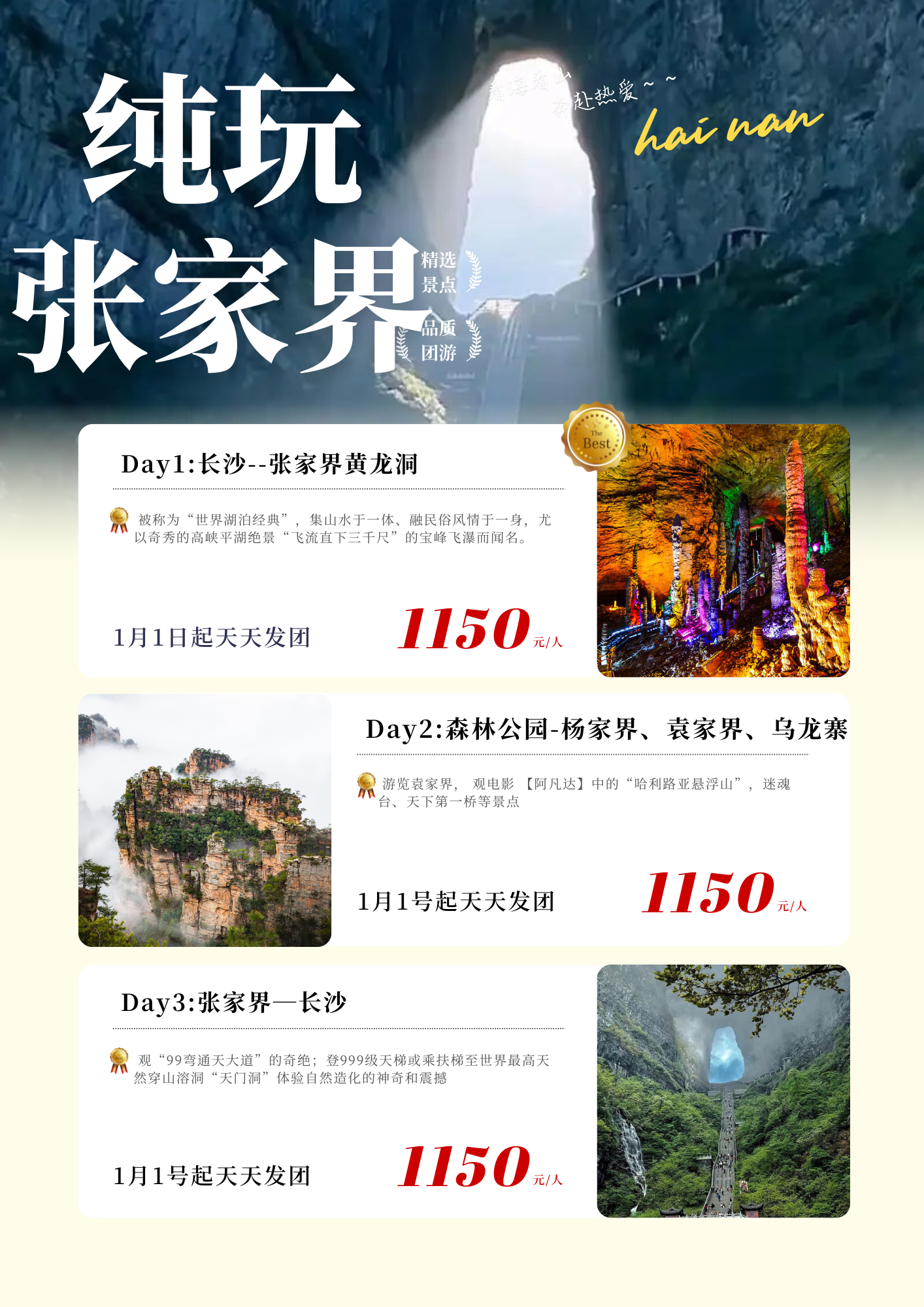 远观鬼谷洞;拜求儿洞;游天界佛国天门山寺;乘观光汽车体验天下第一公路奇观【“99弯通天大道”】的奇绝;