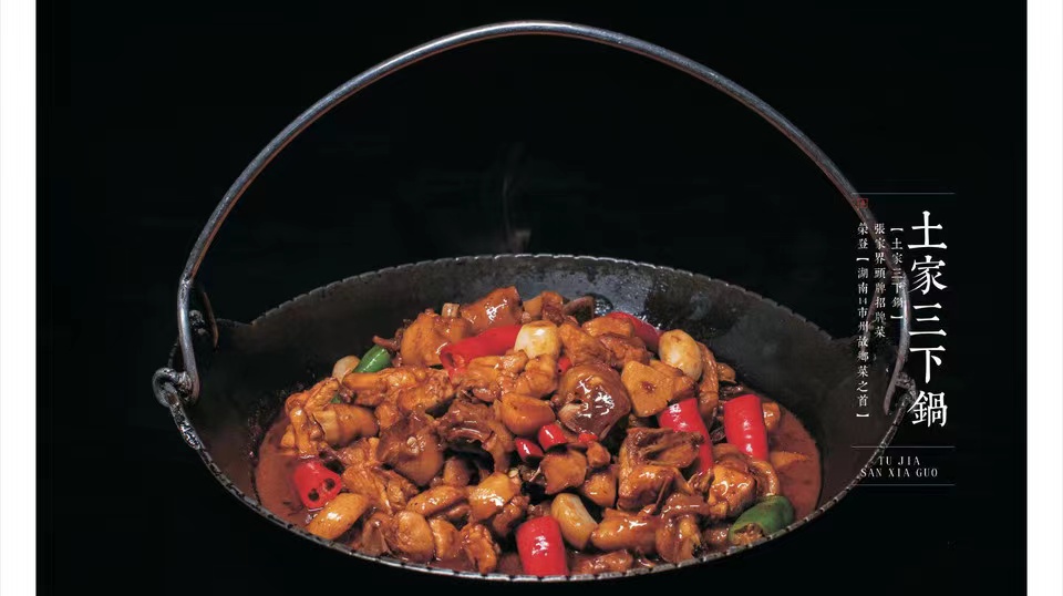 中餐升级为特色风味餐“三下锅”,张家界头牌菜,2009年荣登湖南14市州故乡菜之首。传明代嘉靖年间,朝廷征调湘鄂西土司兵上前线抗倭,恰好赶上年关,为不误军机,土司王下令提前—天过年,于是腊肉、豆腐、萝卜一锅煮,叫吃“合菜”,逐演变成“三下锅”。