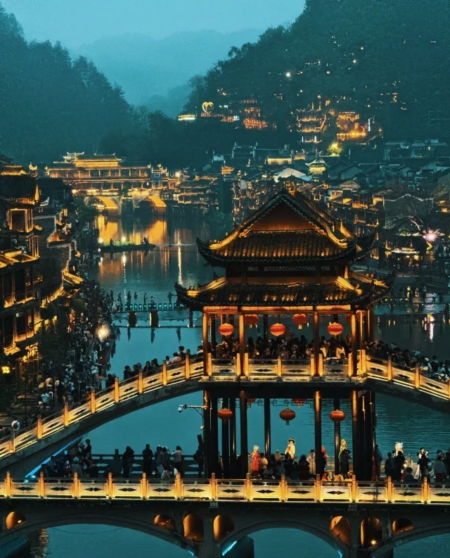 下午乘车赴湘西,游览挂在瀑布上的土家第一镇-【芙蓉镇】(电瓶车28元/人自理),该镇美誉为:“中国历史文化名镇”、“挂在瀑布上的千年古镇”、“中国十大美丽乡镇之一”“土家之源、土家之都”、“最朴实最美妙的影视拍摄基地”,后赴凤凰入住酒店,可自由欣赏凤凰夜景。
