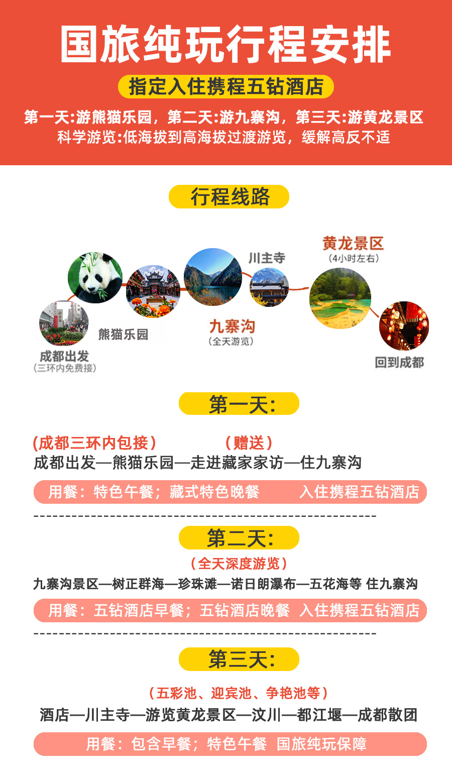 九黄熊大巴/高铁3天2晚跟团游—九寨沟+黄龙+熊猫乐园