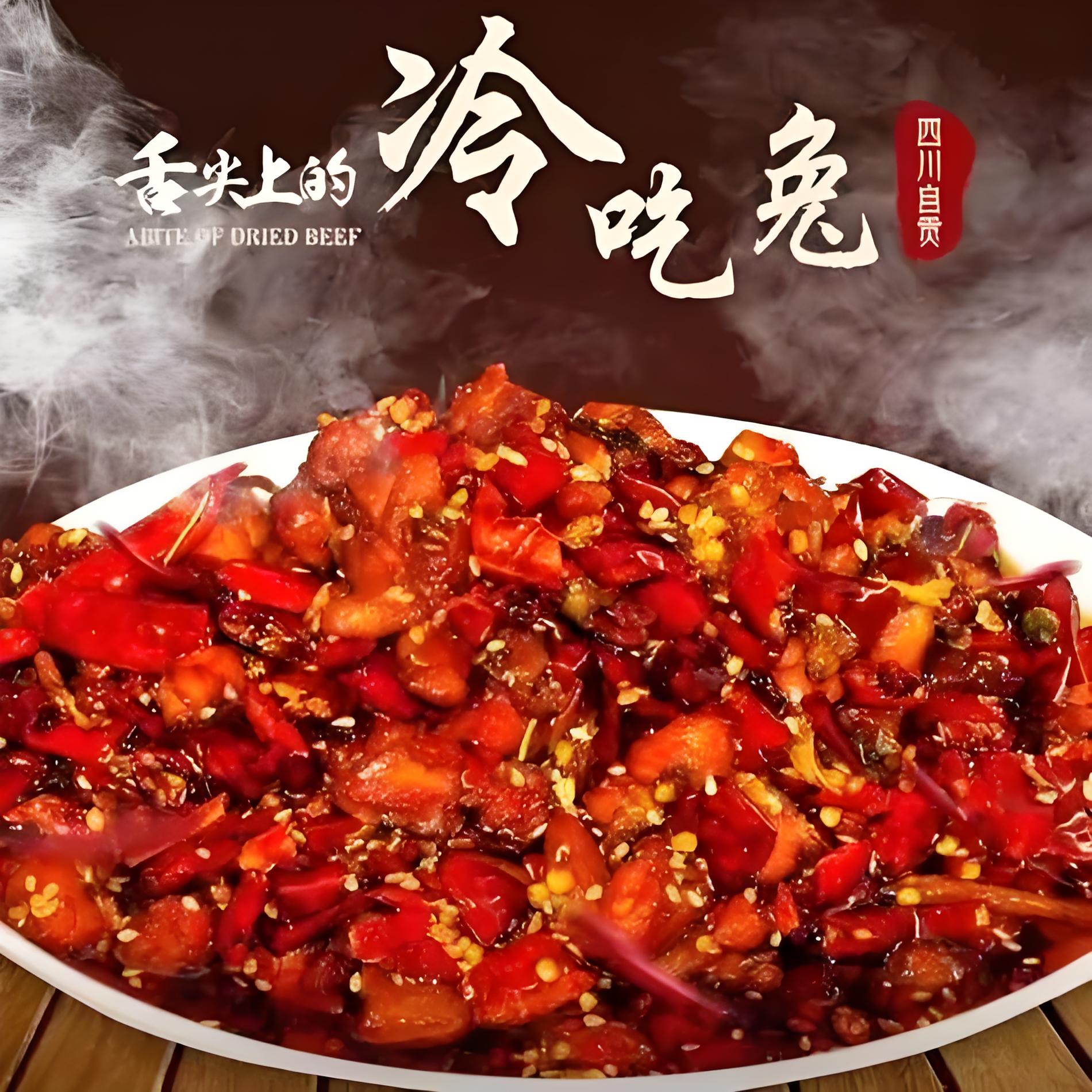 晚上:在自贡市区品尝冷吃兔,兔肉鲜香麻辣,口感劲道,是自贡的特色美食之一。