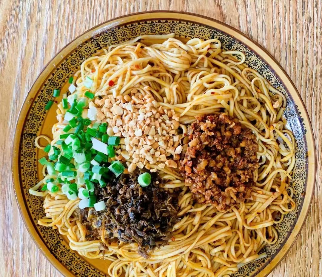 中午:在冠英古街附近品尝宜宾燃面,面条筋道,辣香爽口,再配上一碗清爽的面汤,开启美好的美食之旅。