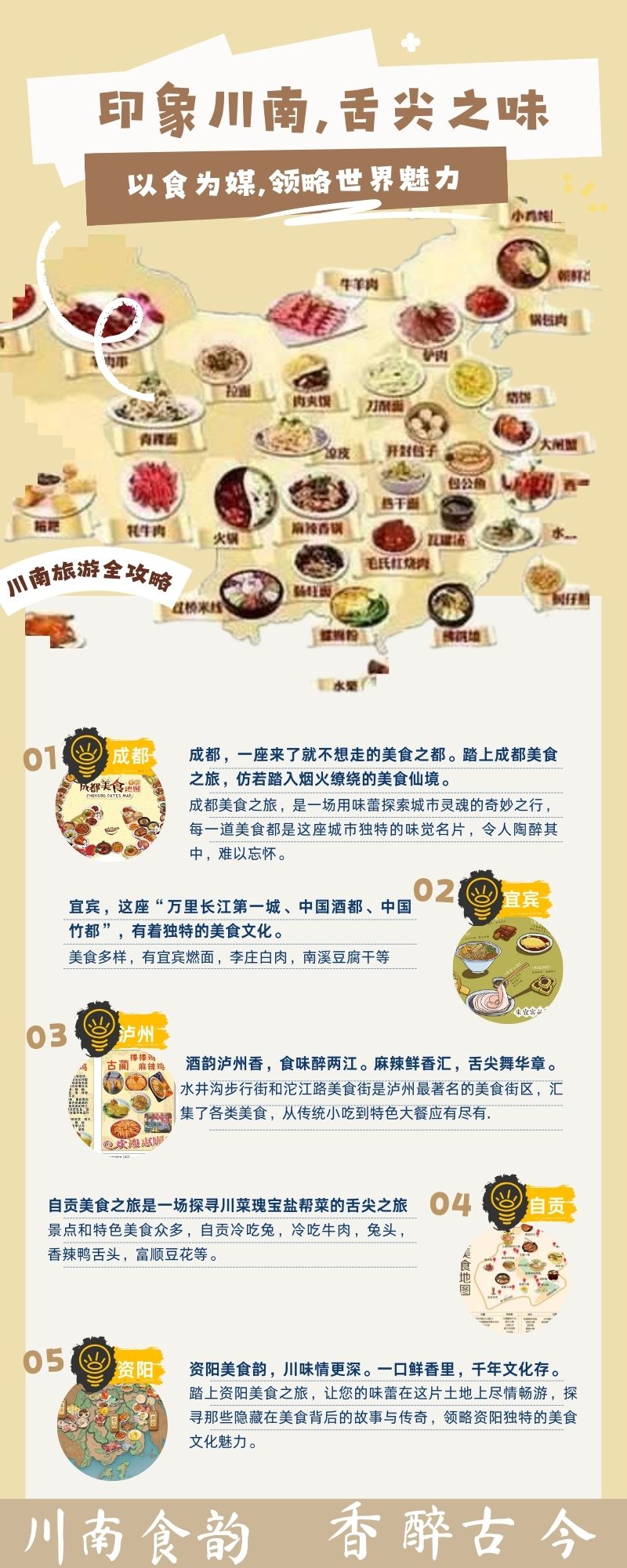 - 美景相伴:川南有蜀南竹海等自然景观,在欣赏美景后品尝当地美食,更添旅行乐趣.