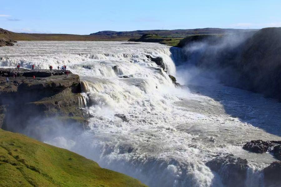 下午:前往黄金瀑布(Gullfoss):这座壮观的瀑布是冰岛最大的瀑布之一,其宽阔的水帘和轰鸣的水声令人印象深刻。您可以沿着步道走到瀑布边缘,近距离感受其磅礴的气势。