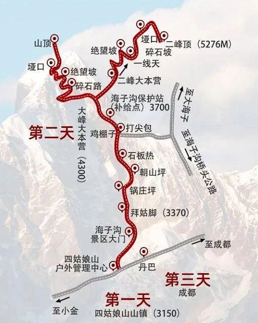 第三天:大本营→冲顶大峰/二峰峰顶(海拔:5025/5276米)→四姑娘山镇→成都