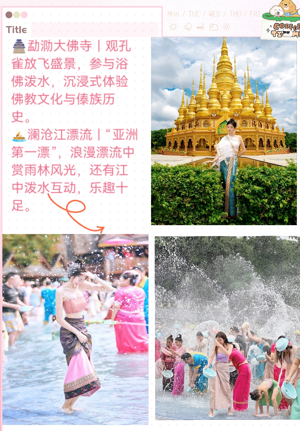 带园林风光,是深度了解西双版纳文化的必到之处还有壮观的孔雀放飞和浴佛泼水活动;