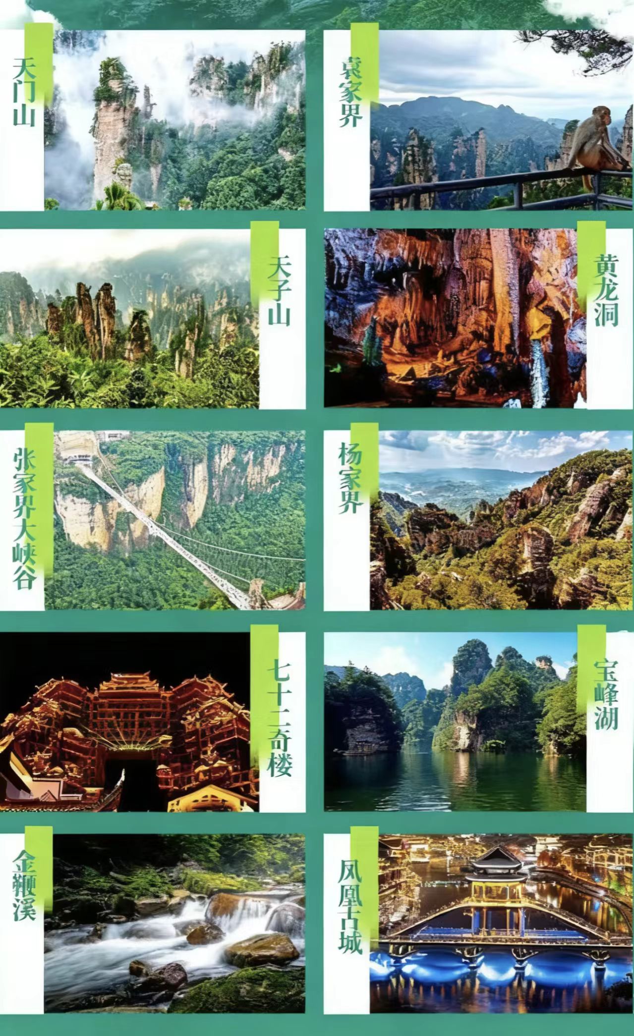 早餐后游览“人类第一次架机穿越自然山洞”、“中国最受外国人欢迎的五十个地方之一”“俄罗斯苏-30战斗机飞行表演地”——【天门山国家森林公园】,乘坐世界最长的高山客运索道——【天门山索道】,体验凌空飞仙般的神奇感觉,空中欣赏壮丽的山水画长卷,直达天门山山顶,观赏奇妙美丽的盆景花园,游览天门翻水、北俯视天门、登云梦仙顶、【玻璃栈道】、天门山寺、体验“云生脚下、奇峰尽览、万象目中”豪迈感觉。山顶游玩后座索道下山至中转站换乘环保车,感受“天下第一公路奇观”——【通天大道】的惊奇体验沿途观赏七级瀑布、金龟驮元宝、将军峰、箭杆峰等景观。抵达上天梯,攀登999级台阶的上天梯,抵达天门洞底,感受造化神奇,尽情欣赏天门洞内外的壮丽景色。