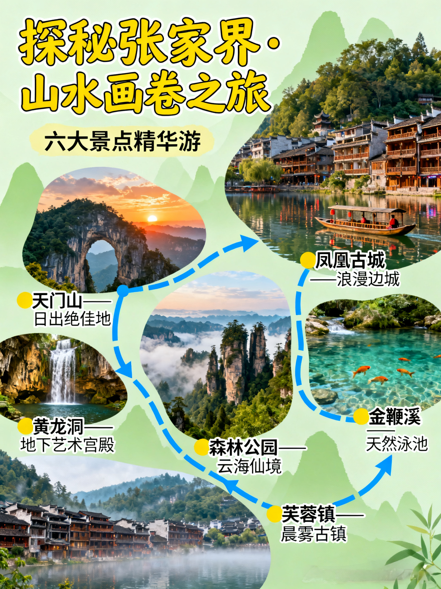 游览沈从文笔下如诗如画般缠绵的凤凰古城 :【沱江泛舟】、【陈斗南故居】;耐人寻味的古桥石栏,街边小店里西兰卡普,竹器等工艺品琳琅满目,尝尝当地的特色小吃,会令你食欲顿生,一尝难忘,让您感受真正悠闲的凤凰古城之行