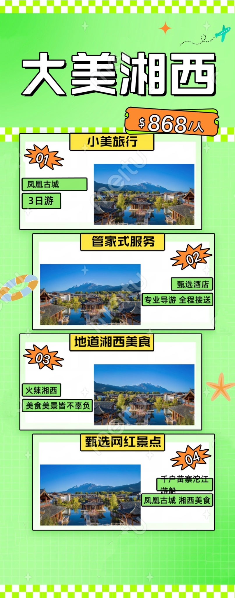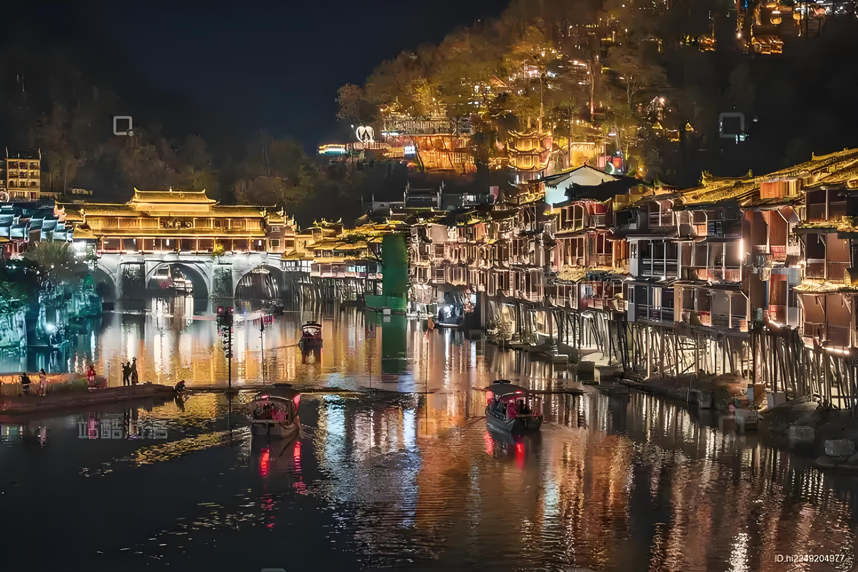 第一天:长沙-凤凰 游览沱江下游游船,参观民俗晚会,品尝古城特色小吃