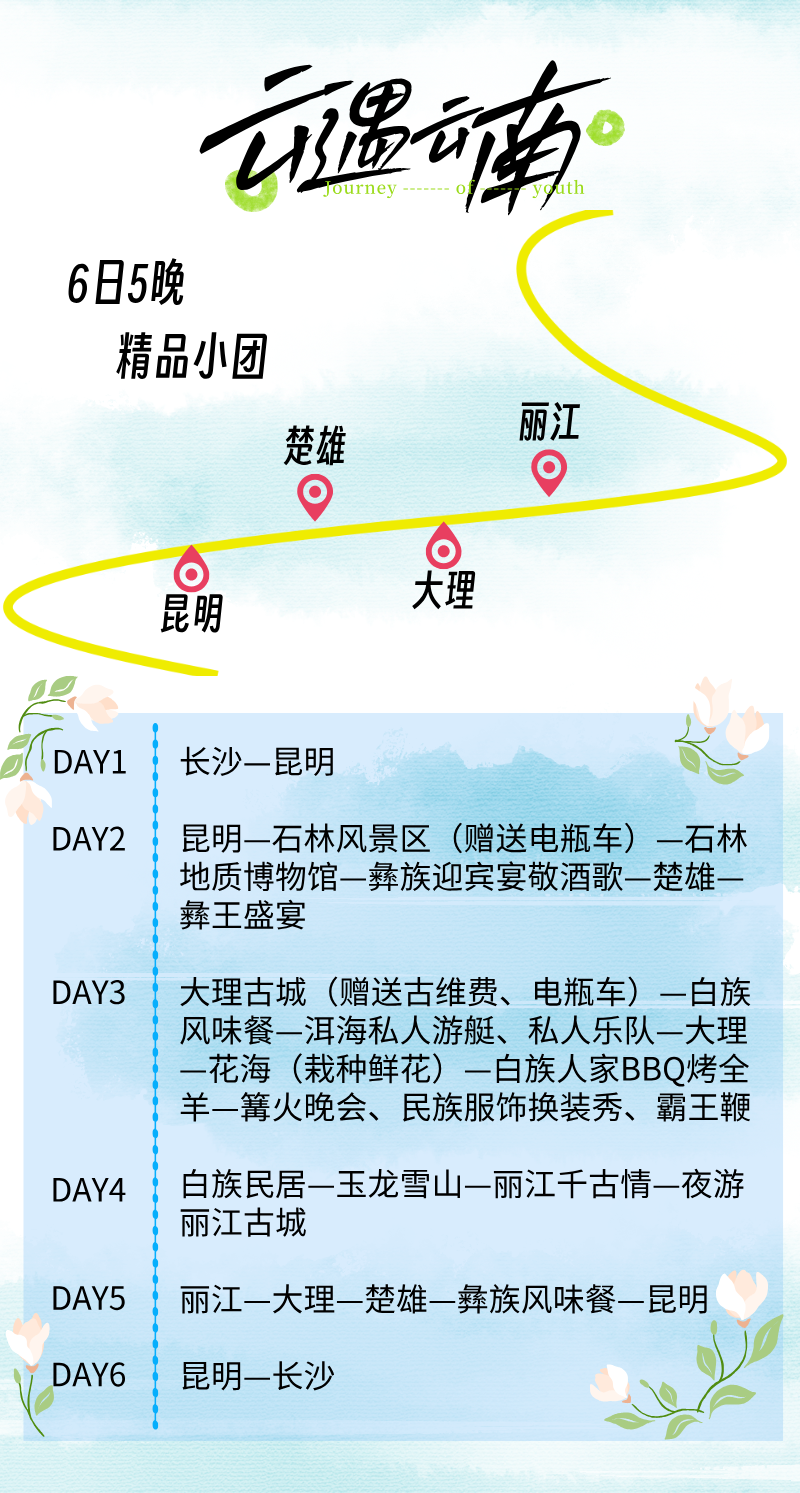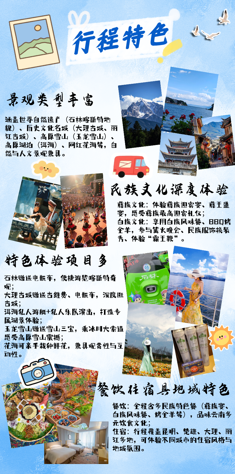 【 交通便捷】长沙直飞昆明往返,节省旅途时间,出行高效。 涵盖石林(世界自然遗产、地质科普基地)、大理古城、洱海(私人游艇+乐队演出)、花海(亲子栽种体验)、玉龙雪山(冰川大索道)、丽江古城(世界文化遗产)等,自然景观、人文历史、科普教育兼具。 包含彝族迎宾宴、彝王盛宴、白族风味餐、白族篝火晚会、民族服饰秀等,深度感受彝族、白族的民俗文化与饮食特色。 【服务贴心透明】赠送电瓶车、古维费、雪山三宝等项目,0自费,提供机场接站服务,行程安排周到细致。