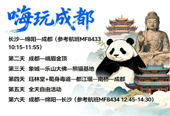 交通与住宿:长沙⇌绵阳往返经济舱(含燃油费)+当地空调大巴,住宿经济连锁酒店,出行舒适便捷。