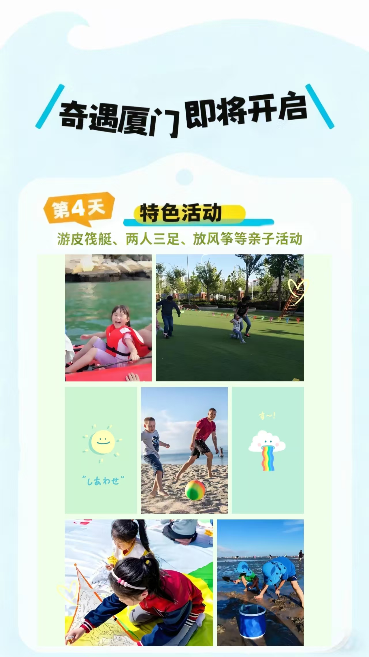 午餐后,由爱国华侨陈嘉庚先生倾资创办的【集美学村】龙舟池、归来堂及铜像广场,各种百年校舍,整体的建筑风格为中西合璧,呈现了典型的闽南侨乡的风格。【鳌园】有着闽南“石雕博物馆”之美称,耗时10年建成,分门廊、集美解放纪念碑和陈嘉庚先生陵墓三个部分。园中共有650多幅精雕细刻、栩栩如生的青石雕,是闽南石文化的主要代表作,包含中外古今、天文地理、科技文教、书法绘画、动物植物、工农业生产等诸多方面,无所不有,无所不包,是个博物大观。被称为中国最美的爱情湾【五缘湾】,由专业教练讲解美式皮划艇知识,后出海体验【皮划艇】平衡稳定和不易翻船的特性让即使是初学者的你也能安心驾驭、轻松上手。如今海上皮划艇已成为时下最流行的运动之一,深受大家的欢迎和青睐。挑战自我,培养团队的凝聚力,增强集体荣誉感,树立迎难而上的坚毅信念。车游【环岛路】是厦门马拉松赛的主赛道,被国际友人誉为世界最美的马拉松赛道。沿途可以观赏到目前世界上离海平面最近的一座跨海大桥“演武大桥”、厦门新地标“世贸双子塔”及鹭江两岸的璀璨夜景。行程结束后入住酒店休息。