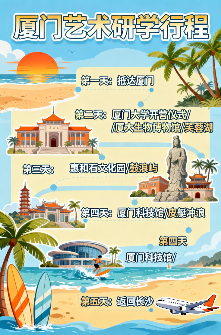 上午:【你好,厦大】。进入【厦门大学】举行【开营仪式】:有参营同学汇聚在一起。会上将介绍如何做好准备工作、强调注意事项和营员纪律,分发夏令营物品;宣布分组情况,选小队长,建立小队编制,介绍带队工作人员,解答营员的疑问。公布夏令营奖项设置,鼓励大家积极表现勇于争创。后参观【厦门大学校史馆】整个校史馆共有展板100多个,近千张照片、图表,配以凝练的文字,全面反映了厦大建校96周年来的办学历程和成就。展示内容分“南强春秋”、“英才摇篮”、“科研重镇”、“走向世界”、“展望未来”五个部分。结束后参观【鲁迅纪念馆】纪念馆现有5个展室,第一室简要回顾鲁迅的人生轨迹及思想历程;第二室陈列鲁迅在厦门时的历史文物资料;第三室是“鲁迅与许广平”专题展览;第二、三室是全馆的展出重点,也是有别于全国各馆的地方。第四室辟作纪念室,展有镇馆之宝——五幅1936年鲁迅先生逝世后厦门文化界举行悼念活动所用的挽联和挽幛;第五室为鲁迅故居,室内摆设按鲁迅当年居住时的原貌布置。