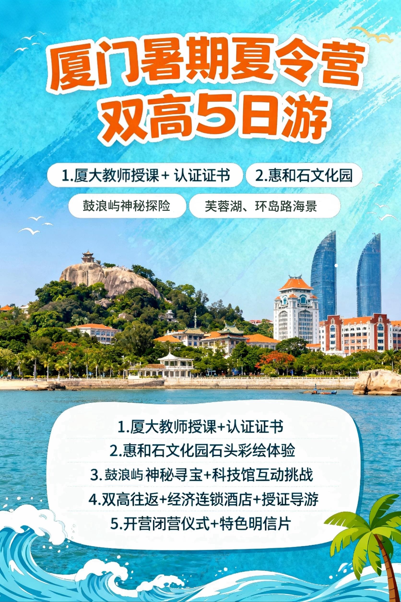 4. 景点及体验费用:厦门大学(含校史馆、鲁迅纪念馆、生物博物馆)参观及教师授课认证证书费用;惠和石文化园门票及石头彩绘体验费用;鼓浪屿往返船票、菽庄花园门票及“神秘寻宝”活动组织费;厦门科技馆门票及纸船挑战、皮艇冲浪等互动项目费用。