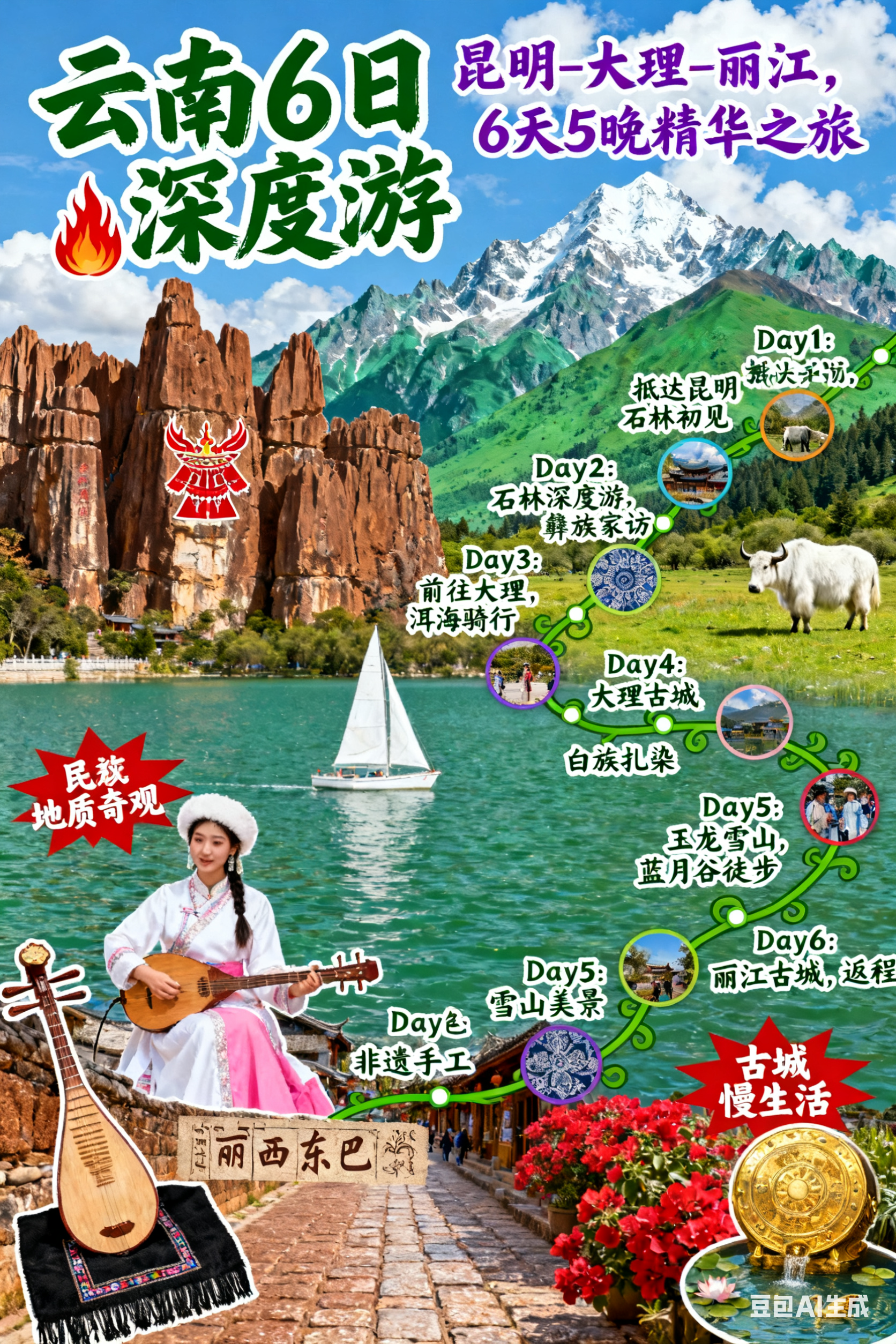 上午:退房后携轻便行李赴滇池海埂大坝(免费,全天开放),观湖景,冬季可喂红嘴鸥。步行至云南民族村(门票 90 元,09:00-18:00 开放),参观村寨,体验歌舞与特色饮食。