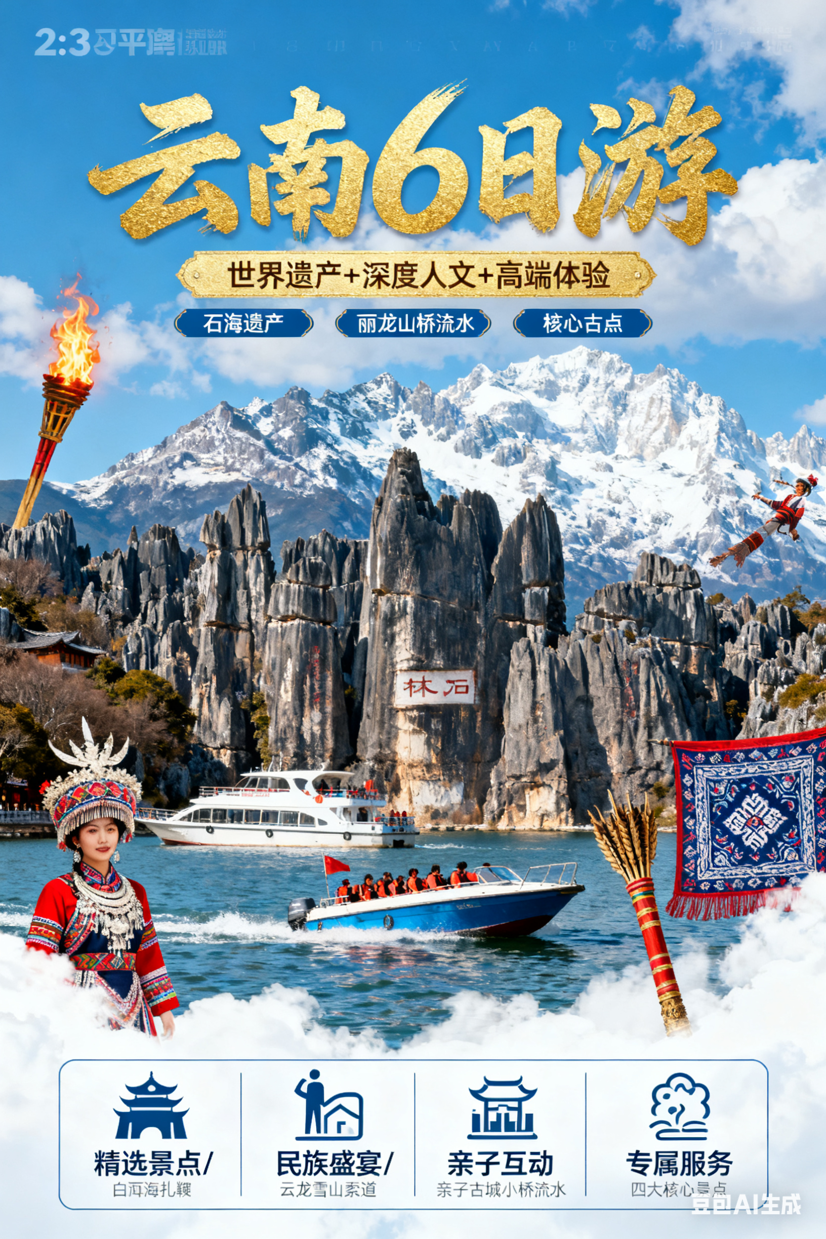 随后前往【玉龙雪山】,赠雪山三宝,乘【冰川大索道】(全长 2914 米,垂直高差 1150 米,国内高海拔客运索道之一)登顶,感受植被变化与雪山震撼。