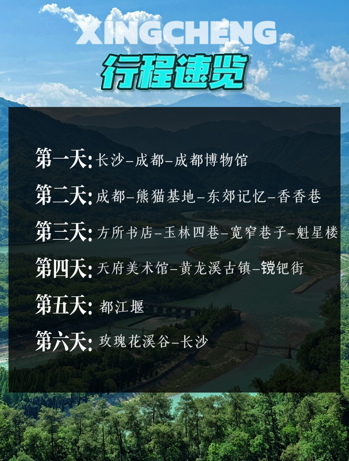 1、交通:长沙/成都往返经济舱机票,含机建燃油费;当地空调旅游大巴