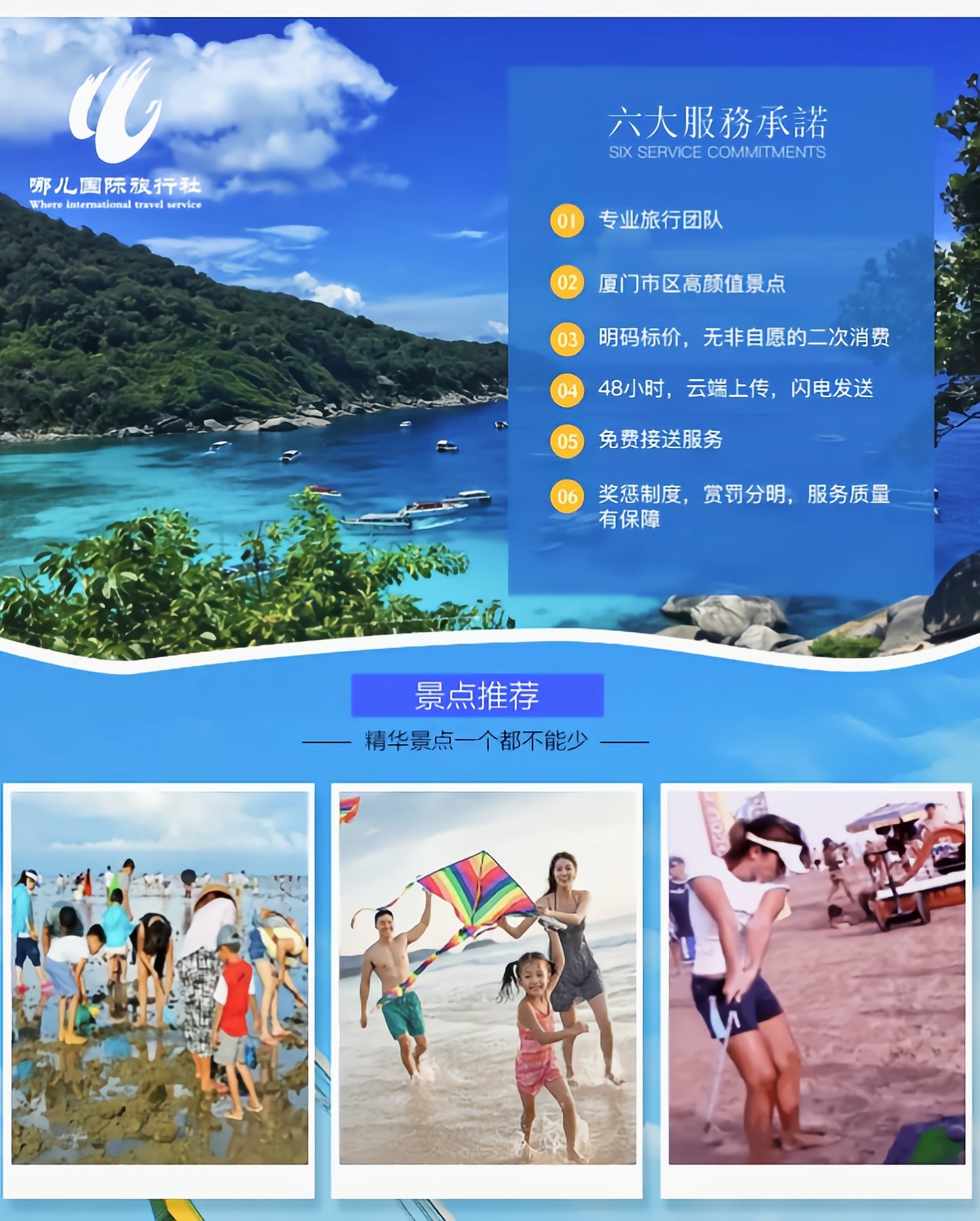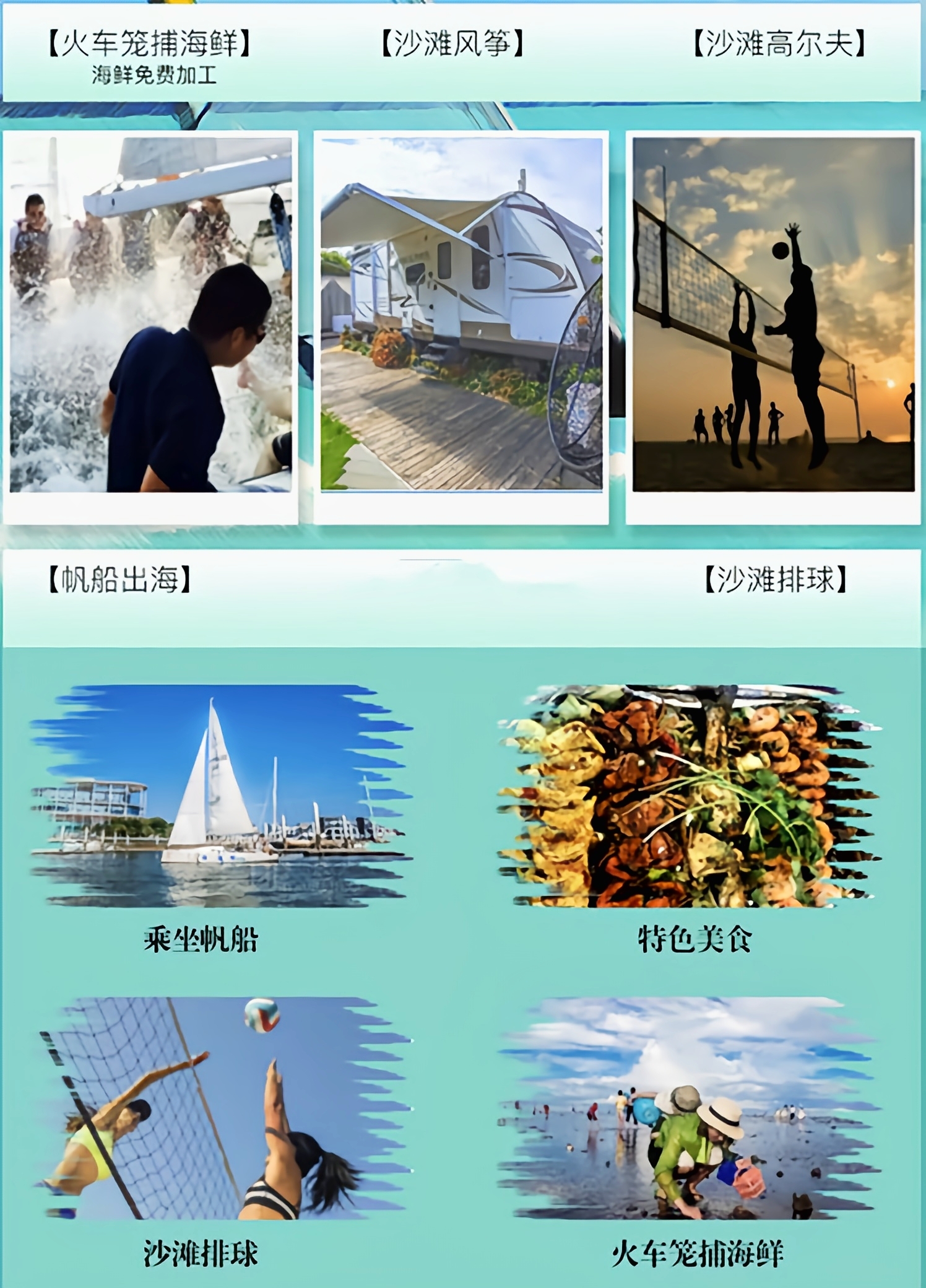 早上跟随教练出发厦门小渔村,漫无边际滩涂,弯弯如月的渔船。排排成立的生蚝海蛎田。渔民就靠此为生。换上渔靴,戴好帽子,背上渔篓,手戴手套,握着铲子冲向滩涂。聆听教练的科普,对面的金门列岛。肉眼直击,渔民海上放牧的野生花蛤。接着前往【围网捕鱼】(游览时间不少于30分钟)用渔民千百年的捕鱼方式体验一把。潮水退去,渔网里面就留有各种各样的海货。海蟹/海鱼/海怪/皮皮虾。都有机会映入眼帘,盯好海货,提前下手。提着收获前往餐厅免费加工享用午餐。之后前往码头随着潮水起落,抛下【地笼】,寄好绳,做好属于自己的标志。静候海蟹跟随秘制饵料。海蟹爬行进去,倒行无路,静候海货,(游览时间不少于30分钟)台湾珊瑚馆位于金门邮轮隔壁。是连接台湾和厦门的一个重要的标志性场馆。让我们一起了解海底珊瑚的形成,接着前往厦门帆船中心体验【帆船出海】/[+100元/人可享受私人游艇出海](乘坐时间不少于40分钟),杨帆起航,5-10人一艘。可缓可急,全由您自行和船长商量把握。收完笼子带着美好的心情回程。行程期间额外赠送【沙滩赶鸭】【沙滩高尔夫】【沙滩放风筝】另有精美奖品赠送。