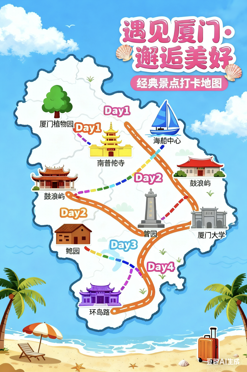 早餐后,游览集美景区(游览时间不少于90分钟),欣赏爱国华侨陈嘉庚独创的集美学村建筑风格,“穿西装、戴斗笠”陈嘉庚纪念胜地【鳌园】、嘉庚故居、归来堂。在厦门美丽的一条五彩情人路之称的【环岛路】(游览时间不少于30分钟)环岛路依海而筑,路面平曲线随海岸线延展,临海见海,绿化带、沙滩、岛礁、海景得到充分展示;感受阳光,蓝天,大海,沙滩组合为一体的迷人风光。游览【曾厝垵】(游览时间不少于90分钟)类似台湾垦丁的小渔村,位于厦门美丽的环岛路上,在那个与众不同的车站,在两座房子中间,取了一块美丽的海,在每一刻每一秒变幻着不同的色彩,也好像这个村子,在城市与现代之间,留下的一份田园,渔村里有N多咖啡厅和特色美食等你去探索,品着咖啡,感受厦门味道…在感受过历史与文化的熏陶,大海与人文的结合,后根据时间由司机安排送机服务(请务必掌握好返回时间,如产生误机自身承担,机场提前两小时送达)返回温馨家园。