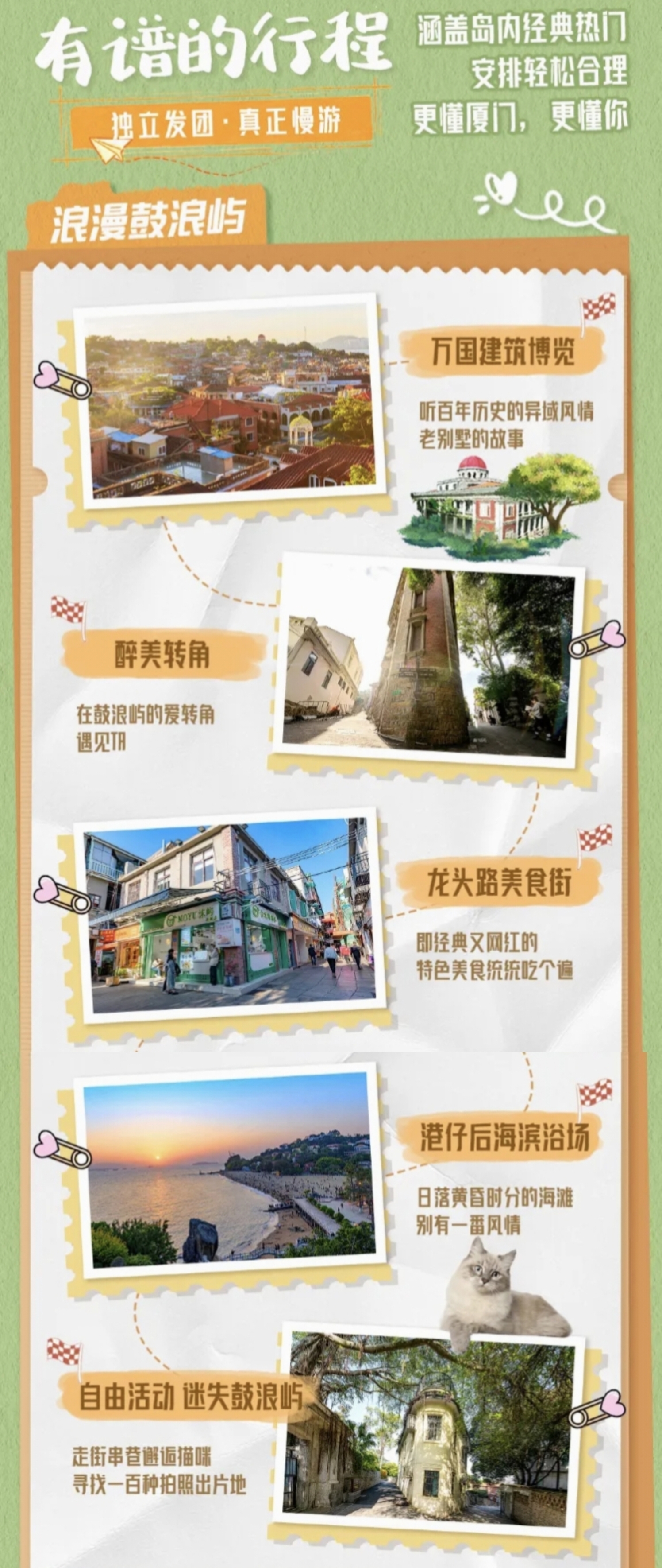 早餐后,前往千年古刹—【南普陀寺】(游览时间不少于30分钟),依山傍海毗邻闽南佛学院,拥有浓郁的佛教氛围。外观—【厦门大学】校园内标志性的芙蓉湖就象一颗璀璨的明珠,在初夏和暖阳光的照耀下,熠熠生辉,美不胜收。沿途而至厦大芙蓉隧道,位于厦大内部,芙蓉餐厅旁,有文艺隧道,有涂鸦隧道,是厦门大学主要景点之一,吸引着无数文艺青年及游客来此观光。下午乘轮渡前往【鼓浪屿】(游览时间不少于90分钟),感受鼓浪屿百年沧桑,沿途经过欣赏各国领事馆旧址、天主教堂。望别具风格“万国建筑博物馆”之称的鼓浪民居,探寻名人足迹。还可望日光岩、郑成功雕像。港仔后沙滩自由散步,土特产一条街自由购物。自由活动。