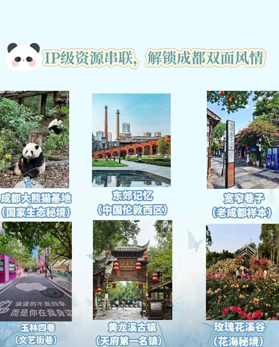 ★ 【精华全景 一个不落】成都大熊猫龙溪镇精华景点,主打一个不走回头路,行程轻松合理,打卡东郊记忆·宽窄巷子·玫瑰花溪谷,颇具复古风格和浪漫氛感。