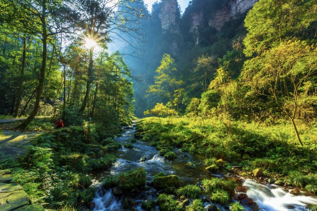 游览【张家界国家森林公园】-因溪水流经金鞭岩而得名的【金鞭溪】:张家界的黄金旅游区,水绕四门,蜿转曲折,幽静异常,随山而移,穿行在峰峦幽谷云间,迤逦延伸于鸟语花香之中(游览时间不少于2小时),车返市区。