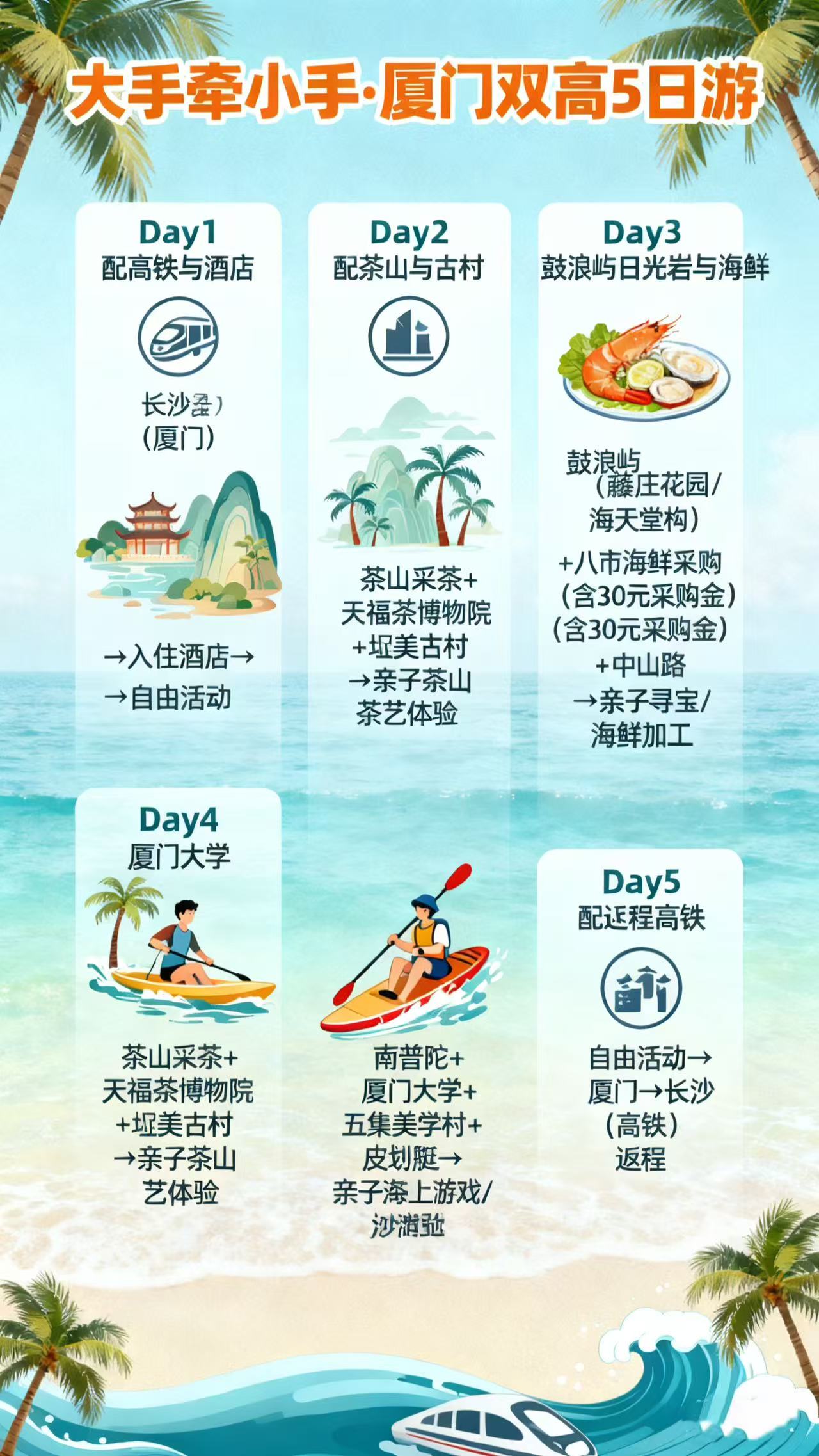 交通:长沙到厦门的高铁二等座,当地空调旅游大巴(儿童报价不含高铁票)。