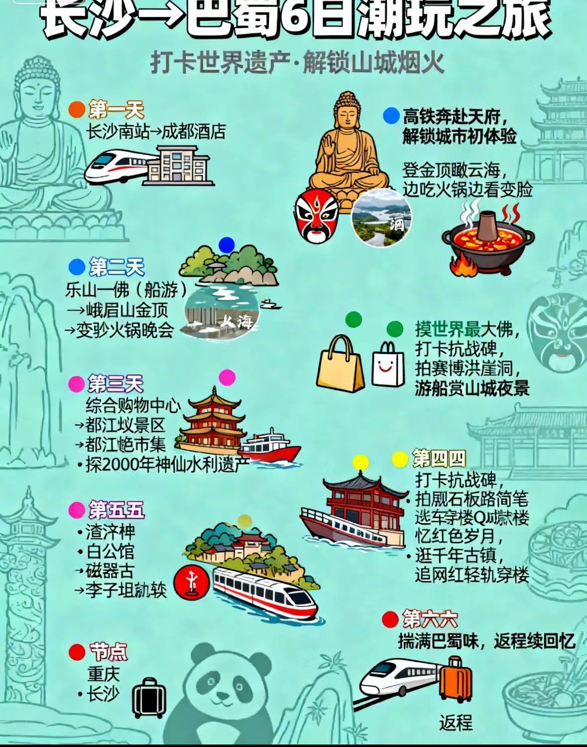 1、交通:长沙/成都往返经济舱机票,含机建燃油费;当地空调旅游大巴
