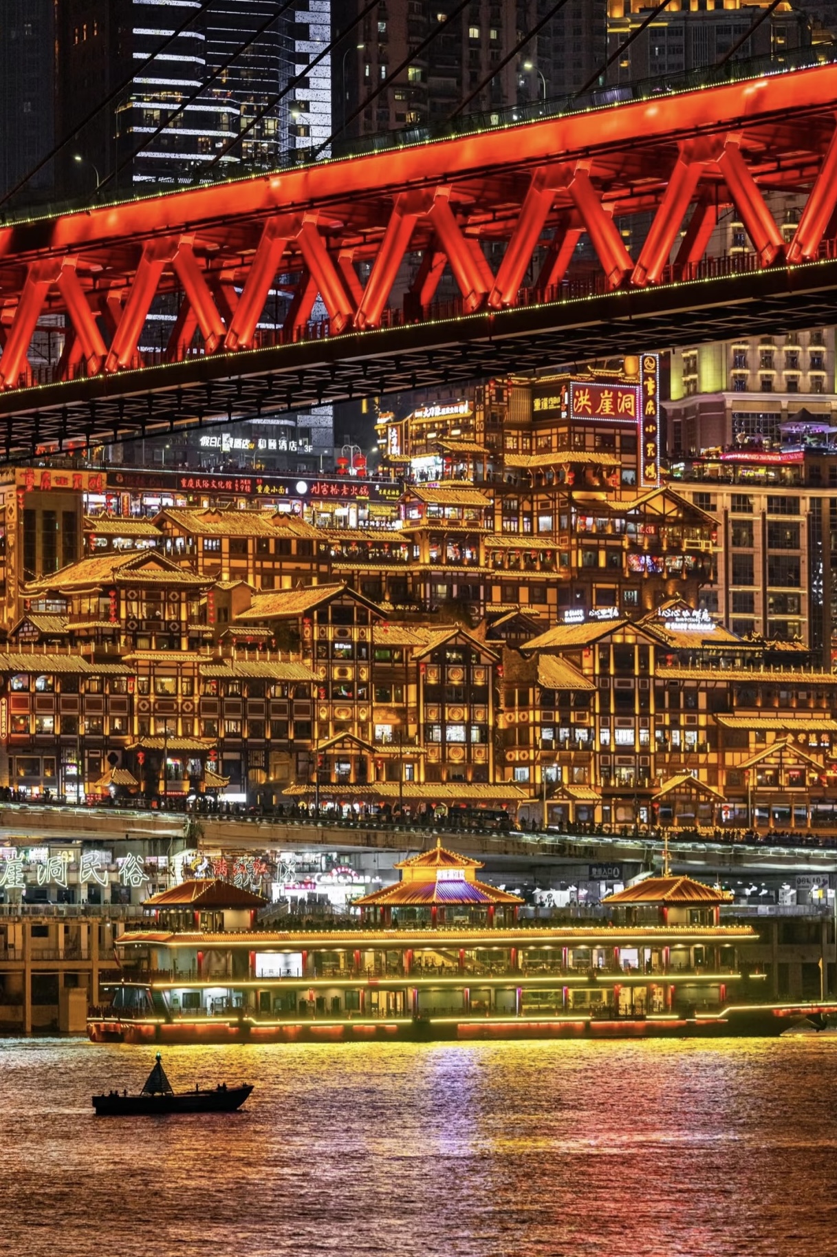 16:30 游览洪崖洞(游览2小时)洪崖洞,拥有2300多年的历史。原名洪崖门,是古重庆城门之一,以其巴渝传统建筑和民俗风貌特色而被评为国家AAAA级旅游景区。19:00 船游夜览长江(游览约45分钟)“不览夜景,枉到重庆”。山城重庆两江四岸的景色早在清代的时候即是巴渝名景之一。自由享用晚餐后返回酒店休息。