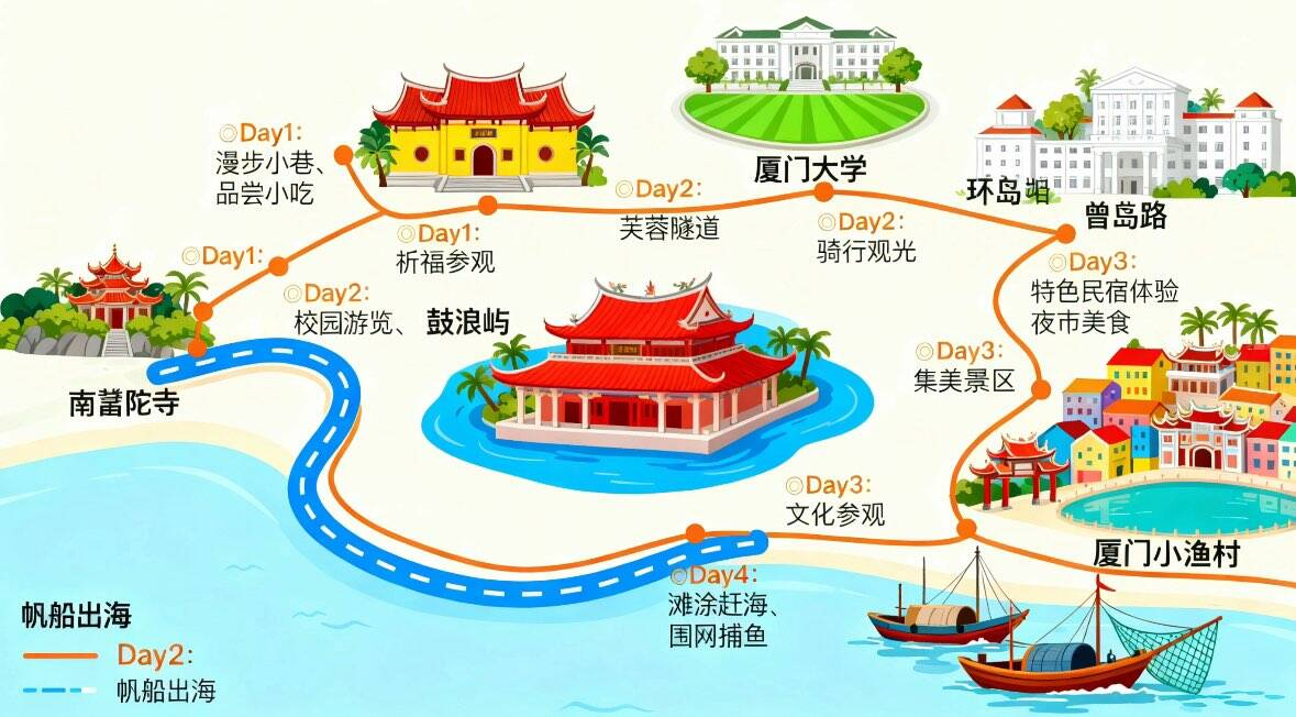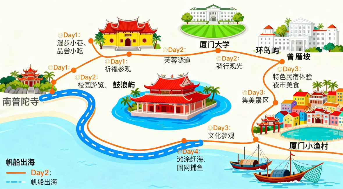游览【曾厝垵】(游览时间不少于90分钟)类似台湾垦丁的小渔村,位于厦门美丽的环岛路上,在那个与众不同的车站,在两座房子中间,取了一块美丽的海,在每一刻每一秒变幻着不同的色彩,也好像这个村子,在城市与现代之间,留下的一份田园,渔村里有N多咖啡厅和特色美食等你去探索,品着咖啡,感受厦门味道…在感受过历史与文化的熏陶,大海与人文的结合,后根据时间由司机安排送机服务(请务必掌握好返回时间,如产生误机自身承担,机场提前两小时送达)返回温馨家园。