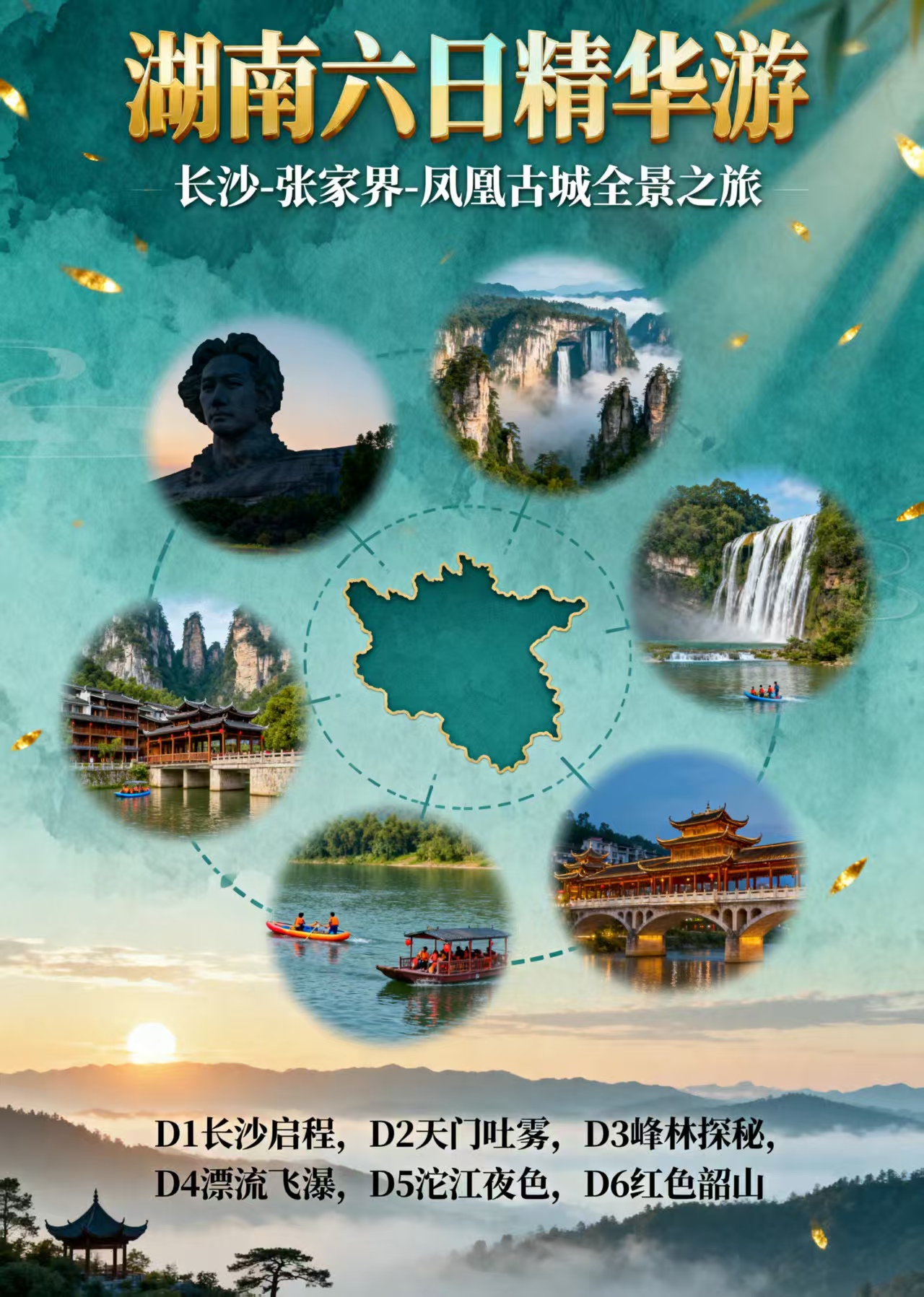 第一天从长沙前往张家界、第二天天门山一日游、第三天和田居山谷,张家界国家森林公园、第四天芙蓉镇,猛洞河漂流、第五天凤凰古城、第六天韶山在返回长沙