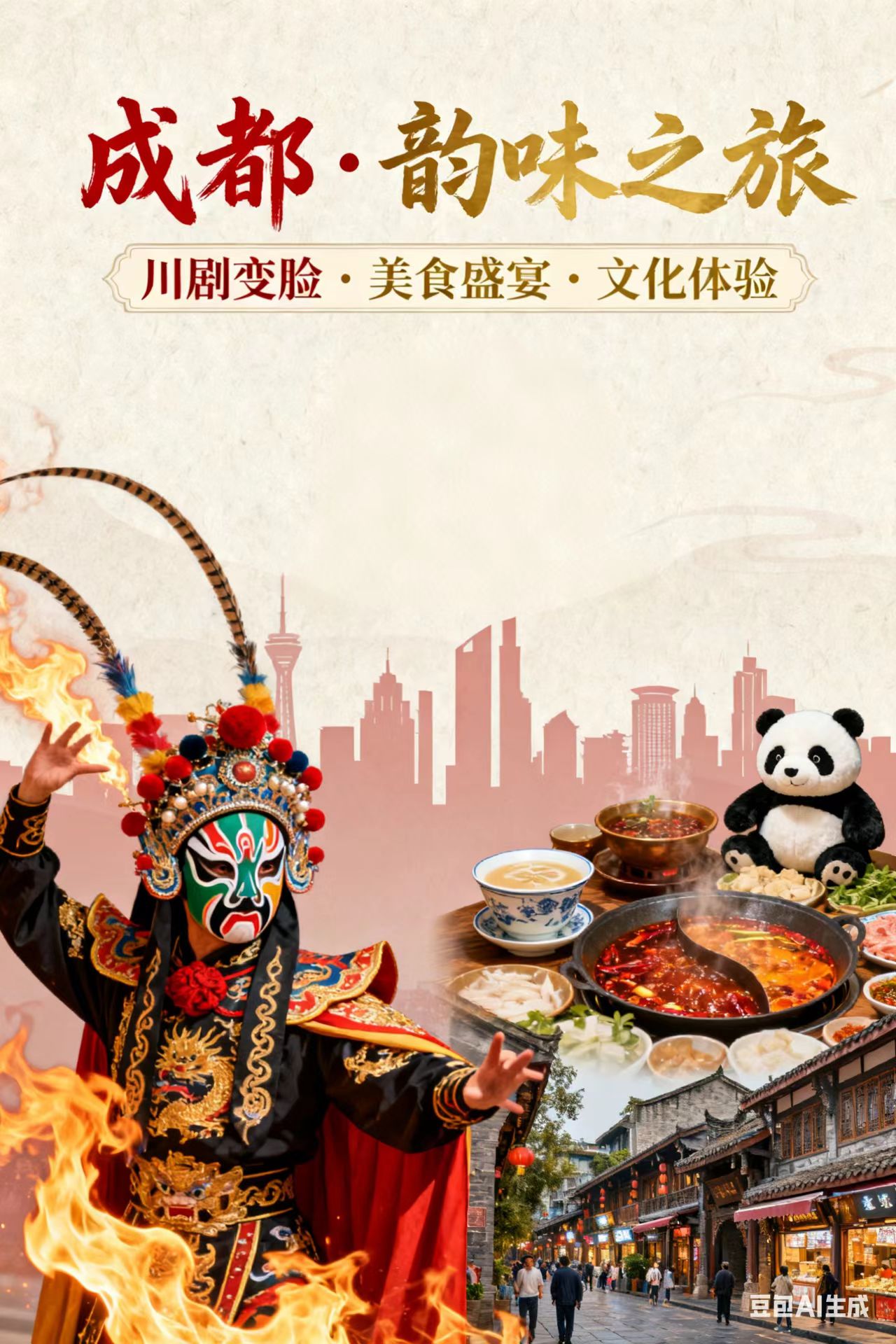 晚餐享用【熊猫主题小吃宴】:专属定制,精挑细选每一道本土小吃,吃的就是经典!凉菜:伤心凉粉、口味凉面,泡菜什锦;热菜:火锅冒菜,鸡汤耙耙菜,滋补银耳;蒸笼:粗粮,川西羊疙瘩,一品熊猫包,椒香手撕鸡,天府叶儿粑,香酥烤鸭,川味干锅。都江堰必吃小吃:【叫花鸡腿】皮薄肉嫩,外配荷叶点缀,十里飘香。