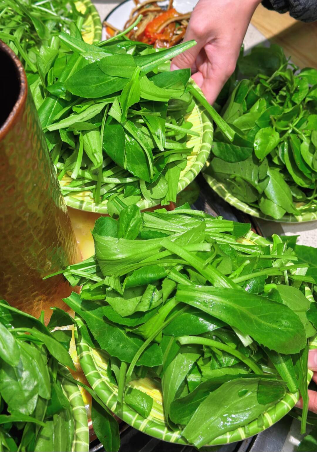 18:30 前往指定餐厅,享用生态野菜铜火锅(用餐时间约1.5小时)。火锅所用野菜均为每日从外地新鲜运输,搭配传统铜锅,汤底则用腊排骨、腊猪蹄、鸡肉及多种豆子共同熬制而成,口感鲜香可口。荤菜:龙泉跑山鸡、生态黑小排、土家腊猪蹄、藏香火腿、有机豆豆;生态野菜:蒲公英、西洋菜、芥芥菜、癞蛤蟆菜、苋菜、面条菜。