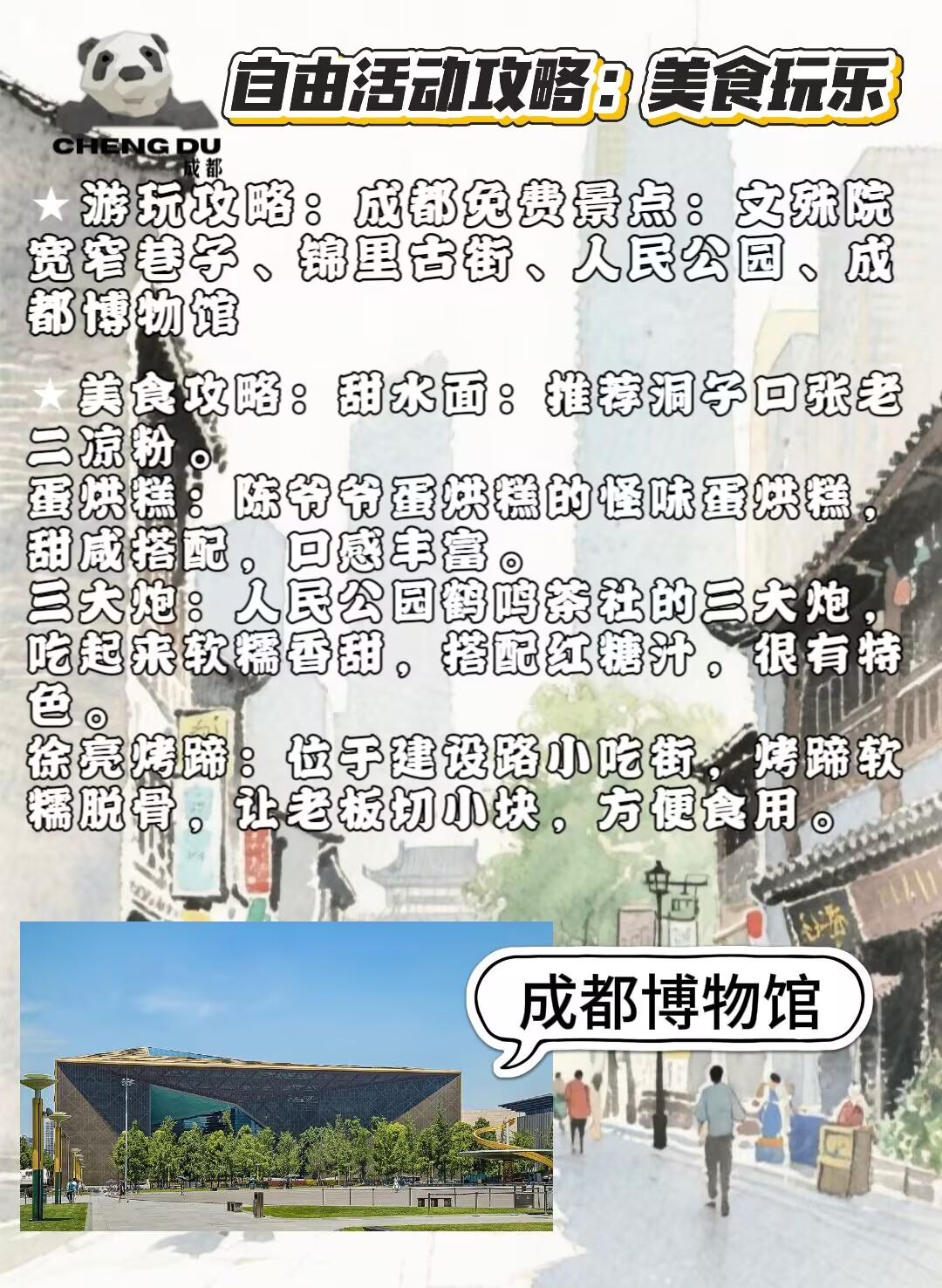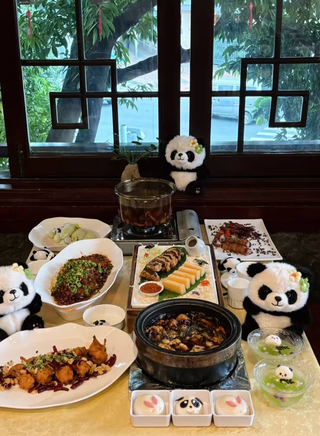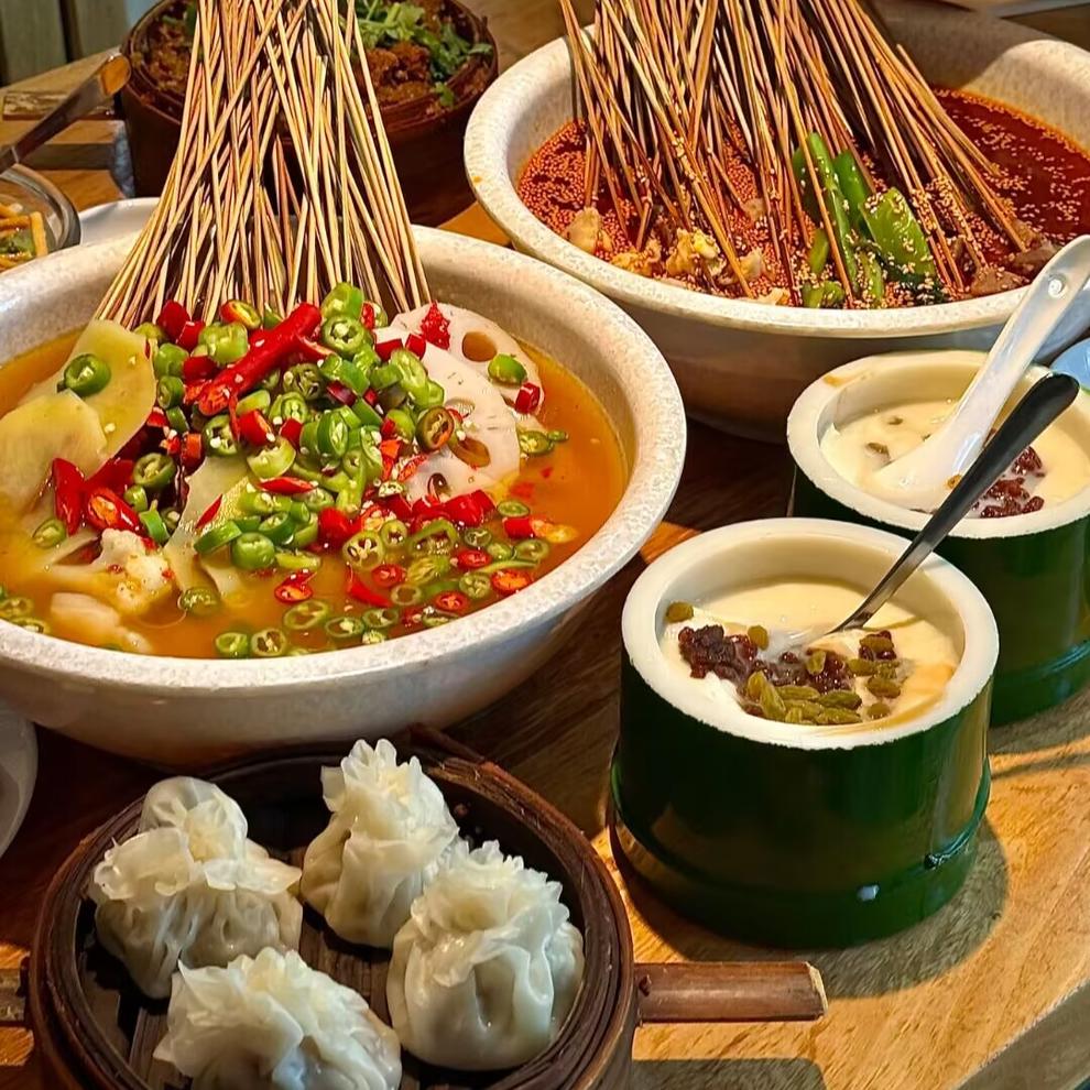 18:00 前往指定餐厅,享用熊猫主题小吃宴(用餐时间约1.5小时)。该小吃宴为专属定制,精挑细选每一道本土特色小吃,主打经典风味。其中凉菜有伤心凉粉、口味凉面、泡菜什锦;热菜及汤品包含火锅冒菜、鸡汤耙耙菜、滋补银耳汤,可全方位感受成都小吃的独特魅力。蒸笼:粗粮,川西羊疙瘩,一品熊猫包,椒香手撕鸡,天府叶儿粑,香酥烤鸭,川味干锅。都江堰必吃小吃:【叫花鸡腿】皮薄肉嫩,外配荷叶点缀,十里飘香。