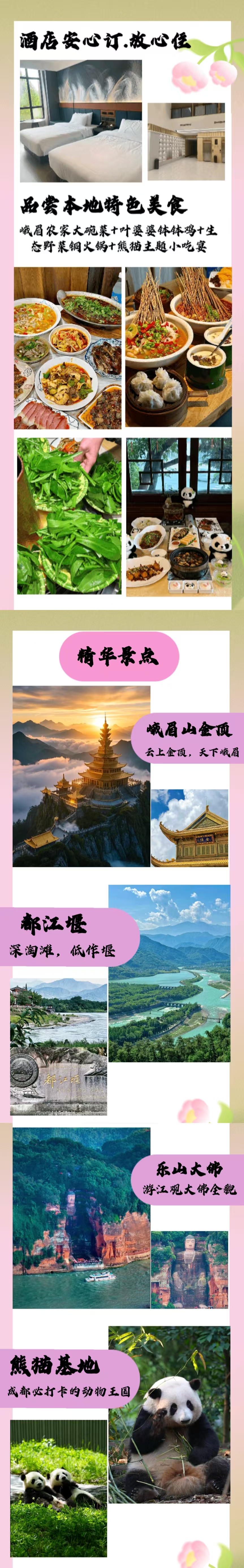 5、门票费用:含行程首道大门票,如峨眉山、乐山大佛、熊猫基地、都江堰等核心景点的入门费用均已涵盖。