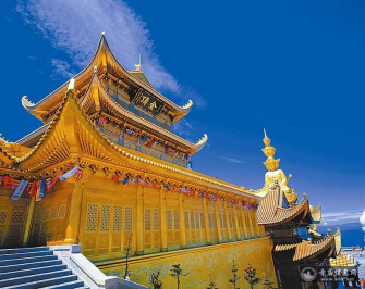 午餐后乘坐金顶往返索道(费用自理,往返120元/人)上金顶。峨眉金顶是以一尊48米高的十方普贤铜像为中心,由耀日的金殿、雄浑的铜殿、灼灼的银殿和洁白的朝圣大道组成的新金顶。金顶为峨眉山游程的最高峰,其海拔为3077米。在峨眉山金顶,还可能欣赏峨眉的四大奇景:日出、云海、佛光、圣灯。