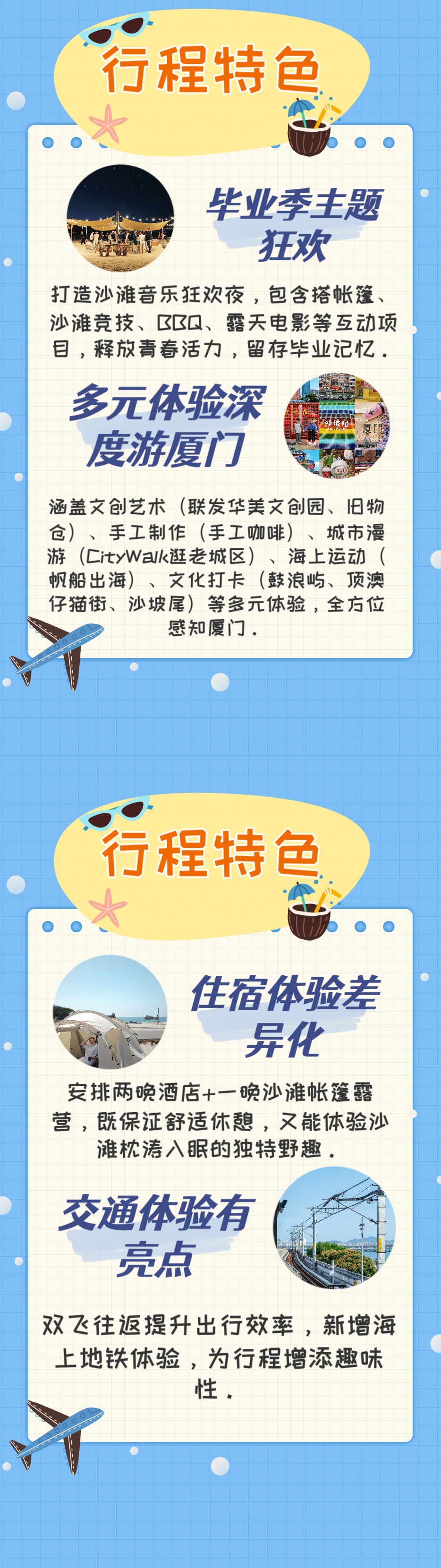 早餐后,乘车前往码头乘坐轮渡前往【鼓浪屿】(轮渡时间20分钟)(备注:①上鼓浪屿岛的时间以船务公司确认的票务时间为准,到时行程可能会前后调整;②鼓浪屿上严禁导游使用扩音器,建议游客自行租用无线耳麦10元/人听详细讲解;③鼓浪屿上特产店、小吃店遍布,游客购买为个人商业行为);游南洋风情的别墅群,旅游购物龙头路一条街,观“万国建筑博物馆”之称的鼓浪屿岛;游客可在鼓浪屿【龙头街】漫步,还可前往【港仔后海滨浴场】:拥有鼓浪屿最美的海滩,是景好、砂好、水质好、气候好的理想天然海滨浴场;下午约定时间返回厦门市区,后安排【沙滩毕业季.音乐狂欢夜】:抵达前往【帐篷基地】搭建属于你的“家”,每组合伙人要【亲手搭帐篷】,要想有地方睡要和伙伴合伙搭建属于你们自己的“小窝”为你们遮风挡雨,其中的酸甜苦辣只有自己知道(如果有不会搭建的可以询问帐篷的主人或者其他会搭建的伙伴)海边趣味【沙滩排球比赛】在沙滩上进行【拔河比赛】(烧烤DIY,BBQ)晚会,导游为大家准备了升火用品及烧烤材料,同学们可自自己动手烧烤,尽情享受自助BBQ的美食,还可围着火堆,看场露天电影,迎着海风,尽情的欢歌乐舞……活动结束后,回到自己搭建的帐篷休息(2人一帐篷),枕着沙滩,听着涛声入眠…
