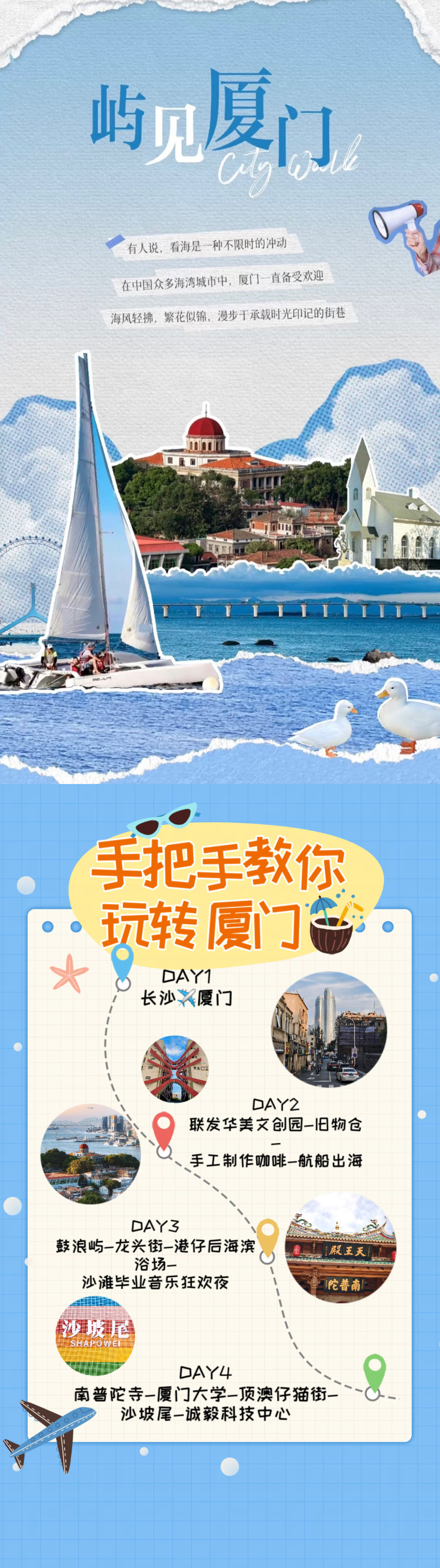 早餐后,前往游览昔日的“华美制烟”老厂房改造的【联发华美文创园】时尚艺术的影子,再到厦门老物件的聚集地【旧物仓】搜罗古董玩意。安排一次独特的【手工咖啡制作体验】。午餐后以CityWalk的方式带大家重新认识厦门,一起到土生土长的老城区看看,走过市井的【百家村】,途径诗意【华新路】还可步行至【演武大桥观景台】;后于【环岛路帆船中心】乘帆船出海体验:美丽迷人的五缘湾景,海天一色的蓝色天堂,升帆、拉帆亲身体验水上运动的激情与魅力!将烦恼、疲倦和困惑统统抖落在容纳百川的大海里。后车送酒店休息。