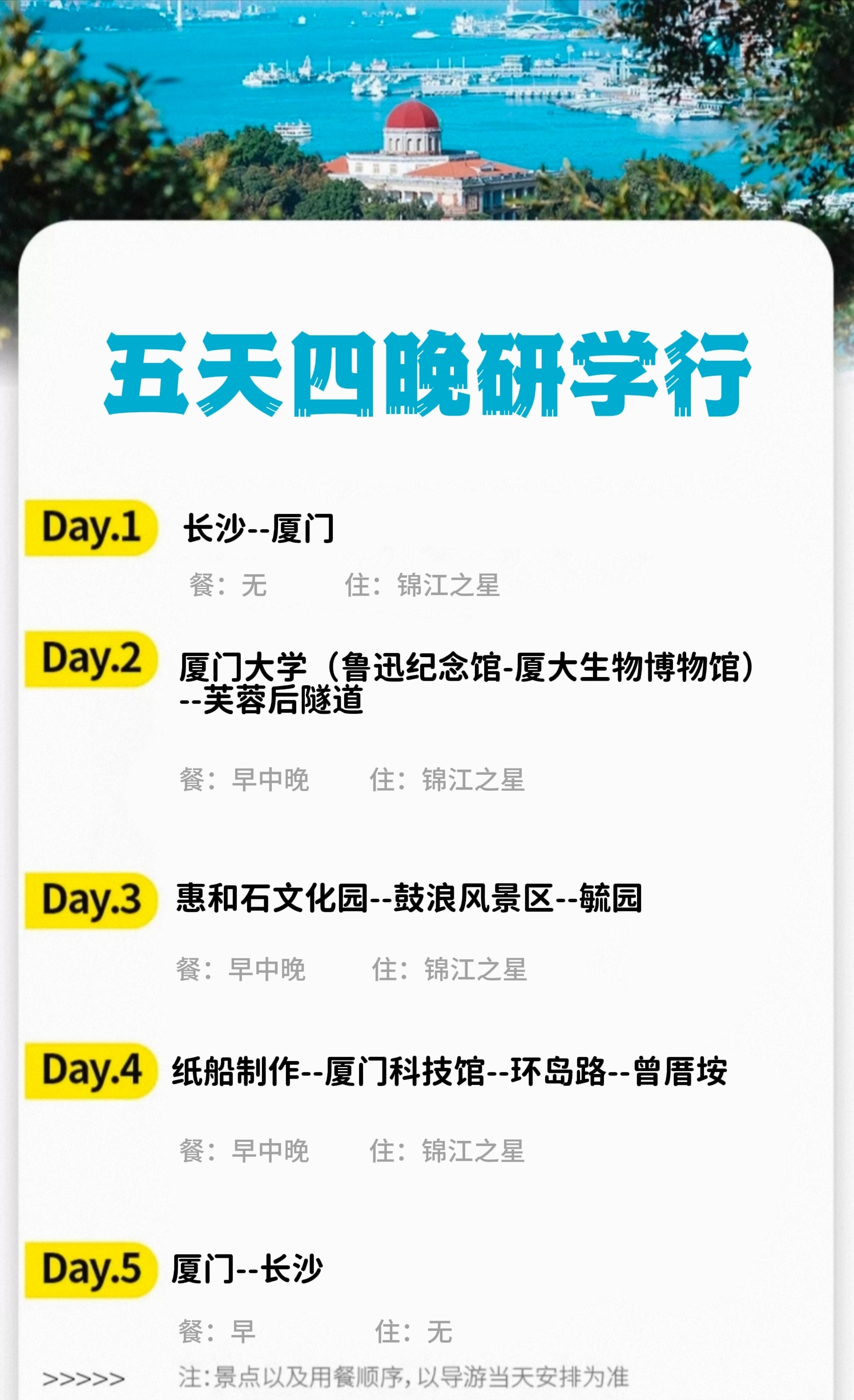 1、交通:长沙—厦门高铁二等座,当地空调旅游大巴
