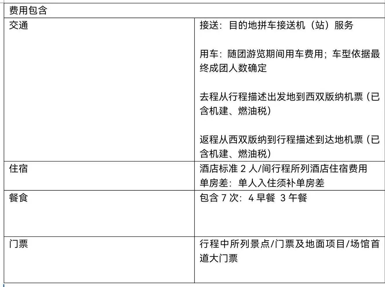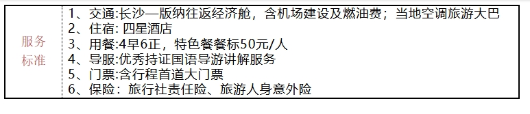 服务 标准 | 1、交通:长沙—版纳往返经济舱,含机场建设及燃油费;当地空调旅游大巴 2、住宿: 四星酒店 3、用餐:4早6正,特色餐餐标50元/人 4、导服:优秀持证国语导游讲解服务 5、门票:含行程首道大门票 6、保险:旅行社责任险、旅游人身意外险 |