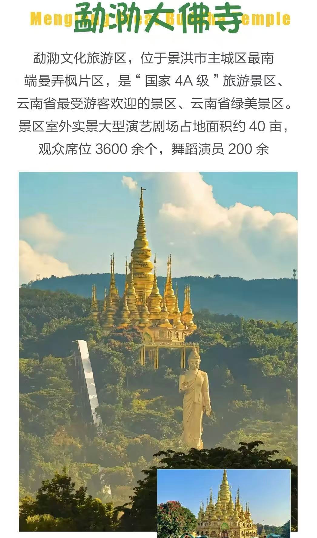 下午乘车前往南传佛教的圣地、世界南传佛教文化中心【勐泐大佛寺】(游览时间2小时左右,可自愿自费乘坐游览观光车单程40元/人,往返60元/人),佛寺按照国家AAAAA级景区标准打造,是在古代傣王朝的皇家寺院“景飘佛寺”的原址上恢复重建的;景区以佛祖释迦牟尼的生平及佛寺活动为主线,九龙浴佛、景飘大殿、神石、国殿、吉祥大佛等,充分展示南传佛教的历史与传统文化色彩。从万佛塔前广场俯视景洪市区,旖旎的热带风光尽收眼底,可体验最具傣族传统特色的泼水体验活动,不在泼水节,一样湿身狂欢,尽情释放,佛光普照之下,为您带来更多的祝福。
