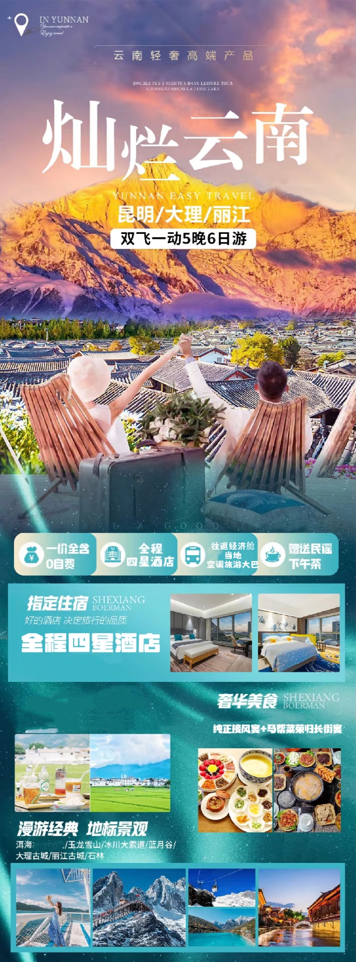 1、交通:长沙—昆明往返经济舱,含机场建设及燃油费;当地空调旅游大巴