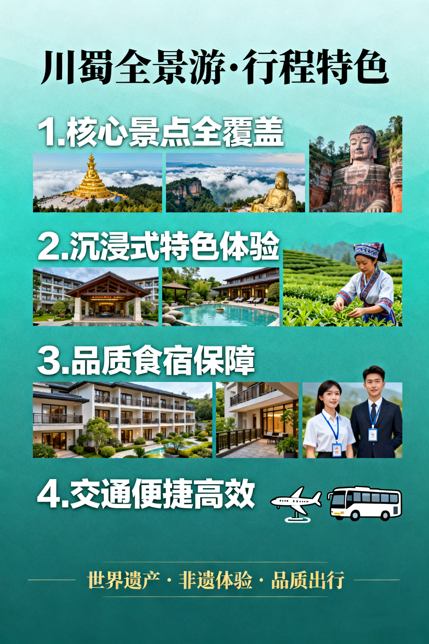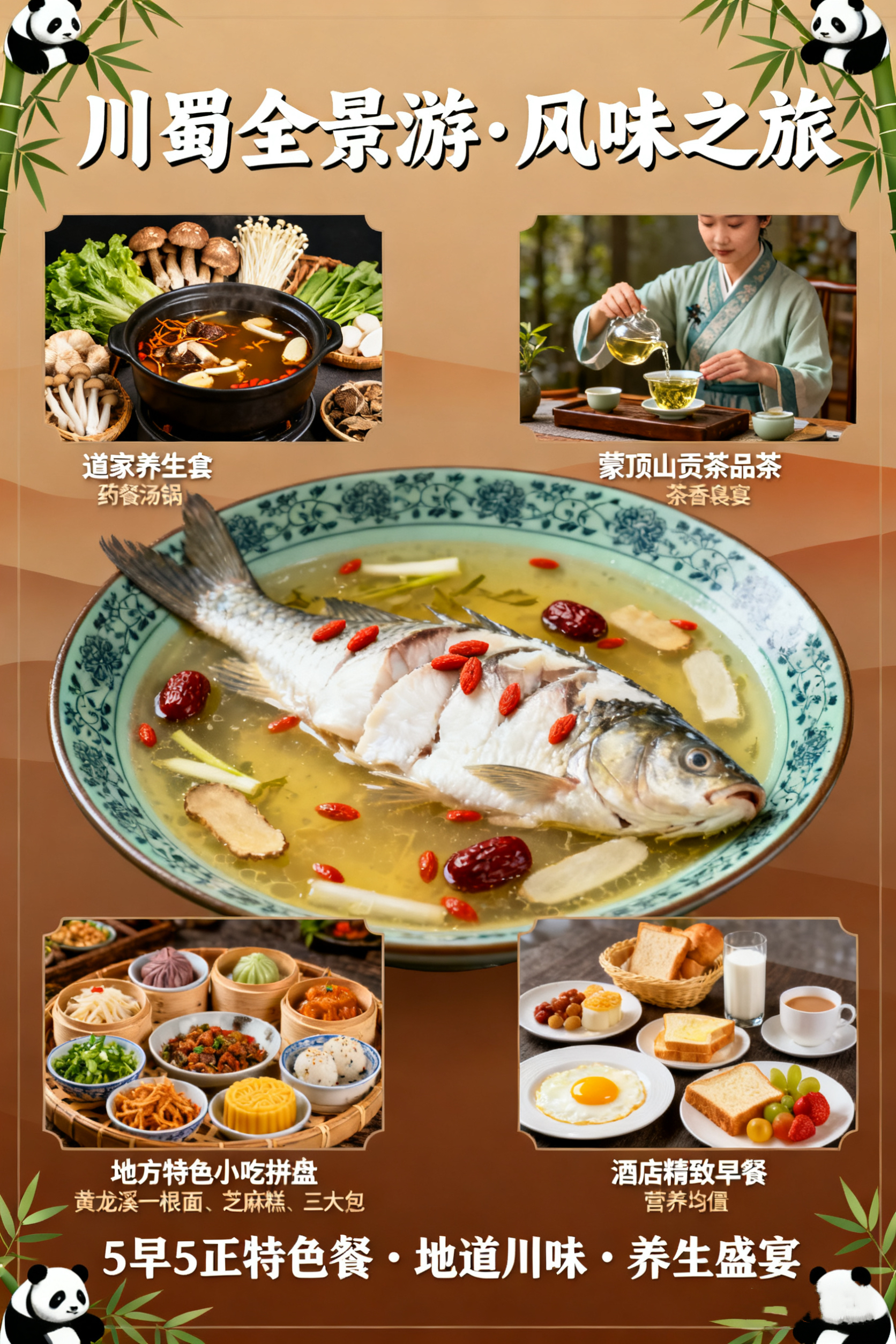 7:00 酒店享用自助早餐后,乘车前往雅安蒙顶山,游览蒙顶山风景区(体验加游览约3小时)【蒙顶山风景区】:国家4A级旅游景区,省级自然与文化遗产;蒙顶山-世界茶文化发源地,世界茶文明的发祥地,茶马古道的起点,生态环境得天独厚普的蒙顶山被誉为“仙茶故乡”。【茶园采茶体验】:在工作人员的带领下,拎上竹篮,到茶园里体验采茶活动,当一回采茶仙子,观炒茶师傅手工制作茶叶,也可自己体验制茶的乐趣。乘索道(自费往返30元/人)至天盖寺,游览天盖寺、千年银杏群、茶神殿、茶文化碑廊、千年茶树王、阴阳麒麟石、甘露泉、皇茶园,而后沿山游道返回天盖寺品贡茶、观非物质文化遗产【龙行十八式茶艺表演】。(体验和观功夫茶艺表演时间40分钟)