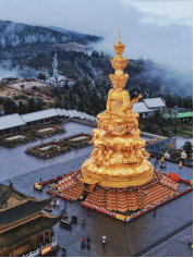 午餐后乘坐金顶往返索道(费用自理,往返120元/人)上金顶。峨眉金顶是以一尊48米高的十方普贤铜像为中心,由耀日的金殿、雄浑的铜殿、灼灼的银殿和洁白的朝圣大道组成的新金顶。金顶为峨眉山游程的最高峰,其海拔为3077米。在峨眉山金顶,还可能欣赏峨眉的四大奇景:日出、云海、佛光、圣灯。