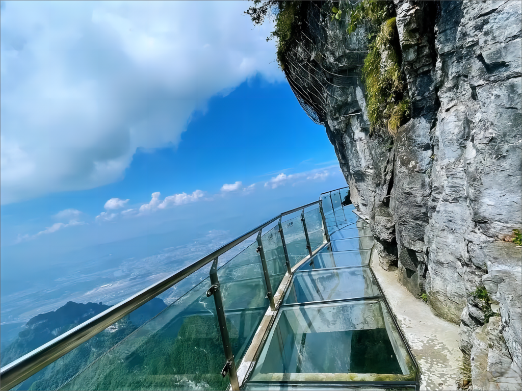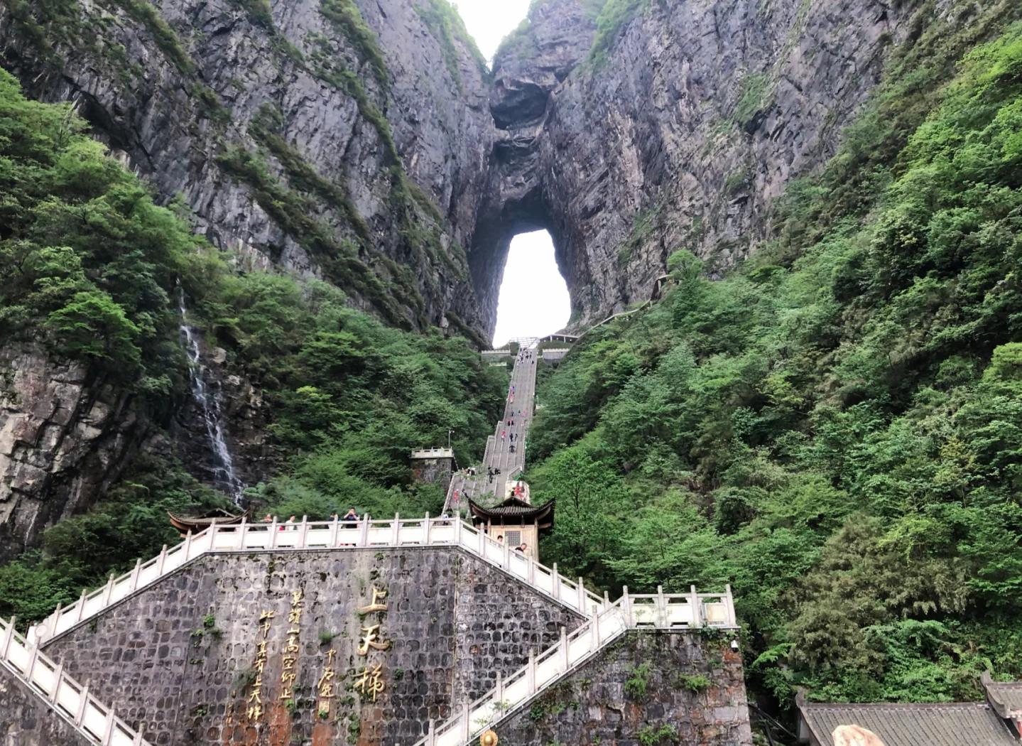游览“人类第一次架机穿越自然山洞”、“中国最受外国人欢迎的五十个地方之一”“俄罗斯苏-30战斗机飞行表演地”——【天门山国家森林公园】,乘坐世界最长的高山客运索道——【天门山索道】,体验凌空飞仙般的神奇感觉,空中欣赏壮丽的山水画长卷,直达天门山山顶,观赏奇妙美丽的盆景花园,游览天门翻水、北俯视天门、登云梦仙顶、【玻璃栈道】、天门山寺、体验“云生脚下、奇峰尽览、万象目中”豪迈感觉。山顶游玩后座索道下山至中转站换乘环保车,感受“天下第一公路奇观”——【通天大道】的惊奇体验沿途观赏七级瀑布、金龟驮元宝、将军峰、箭杆峰等景观。抵达上天梯,攀登999级台阶的上天梯,抵达天门洞底,感受造化神奇,尽情欣赏天门洞内外的壮丽景色。